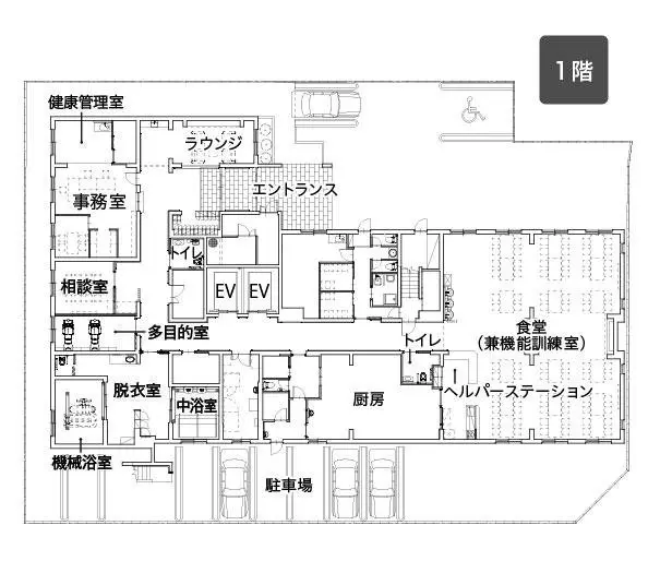 エントランス明るいエントランスには、来館者がすぐわかるよう事務室の受付があります。ご来館時やお帰りの際に事務スタッフとのコミュニケーションが容易となり、ご家族様との一体的なケア提供に取組んでおります。