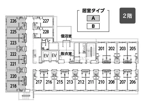 エレベーター前2台のエレベーターで待ち時間を短縮します。車いすでも降車時に後ろを振り返らずに済むよう鏡を設置したり、扉開時間を延長するボタンがあるなどご入居者様に使いやすい設計となっております。