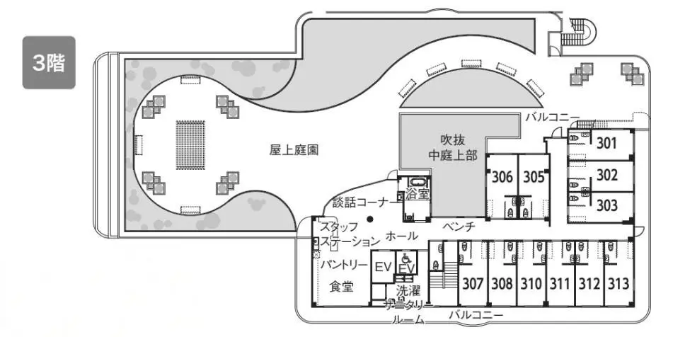 - 3階からはガーデンテラスに出られる様になっています。植栽を複数設置し、天気のいい日にテラスで散歩をするご入居者様もいらっしゃいます。面会の際にもご利用いただけます。