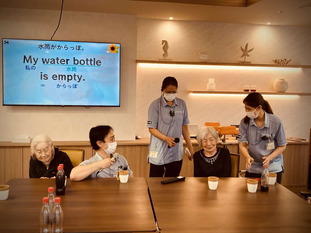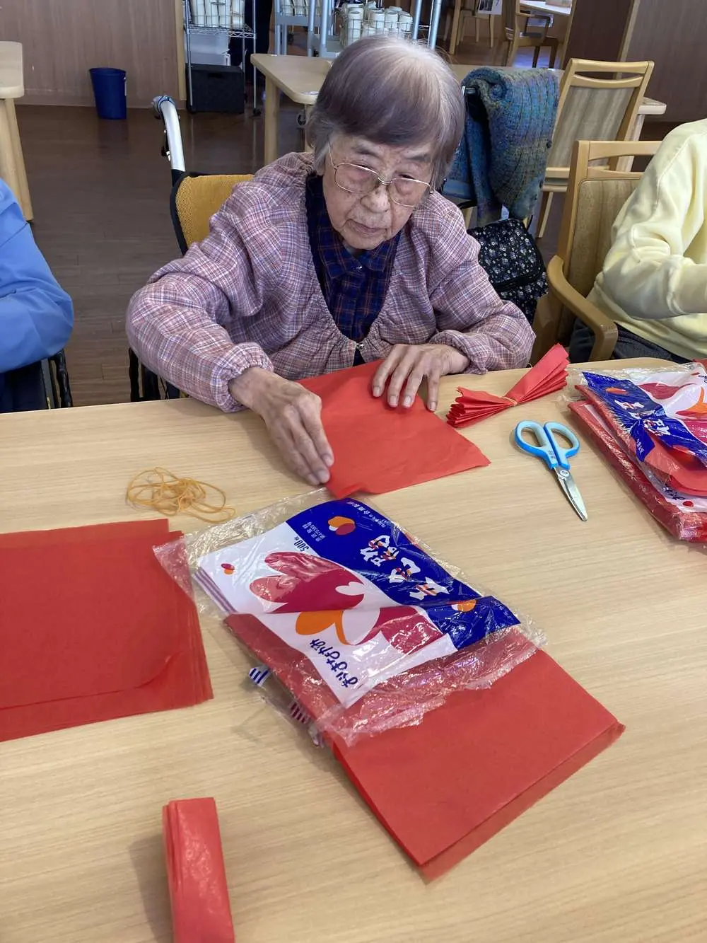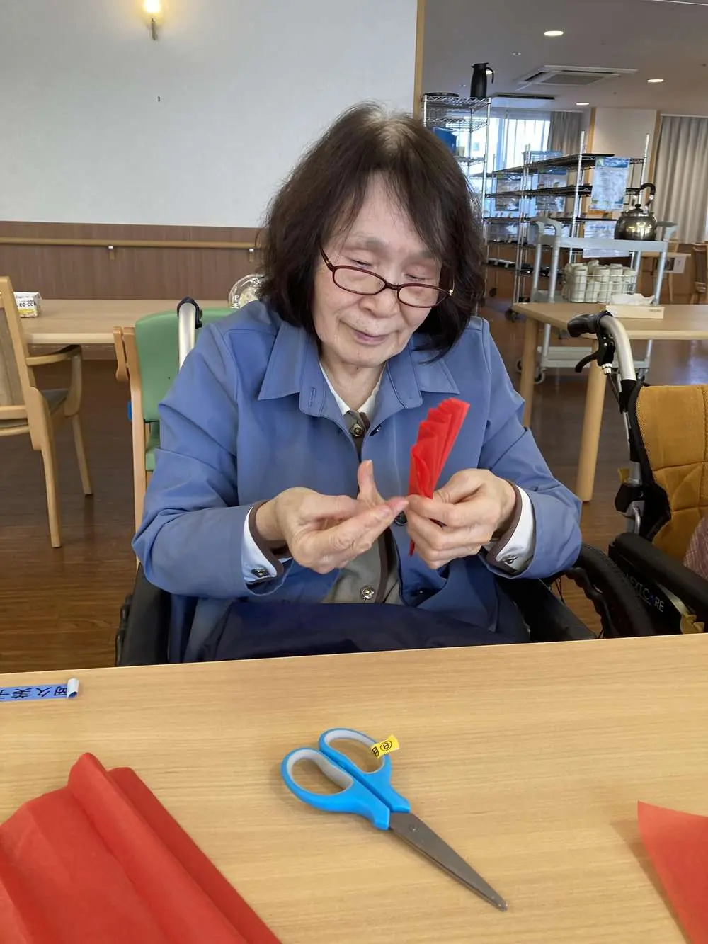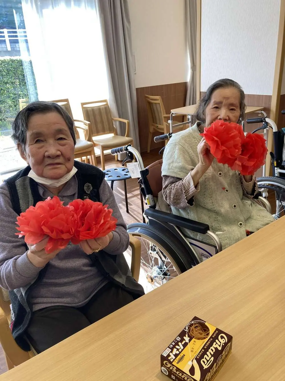 今迄、タオルなどで行っていた体操ですが今回始めてゴムが伸びる分負荷がかかり良い運動になったと思います。ホーム長も初めてのレクで緊張と号令の声掛け、体操効果で汗だくでした(笑)