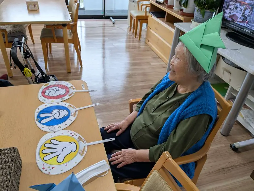 一瞬何をするの?と思いましたが紙コップをみてあ~ぁあれね❢そうです。コップを高く積み上げて行くゲームです。その前に、コップにそれぞれ絵や文字を描き準備をして頂きます。当日、準備体操の後思うがまま積み上げてみましたが、なかなかたかくならず直ぐ崩れてしまいました。そこで、わがスタッフが“皆さ~ん”土台をしっかり作ってから積み上げて~”の声掛けに皆納得され、最終的には8段迄積み上がりました。皆さん頑張りました。
