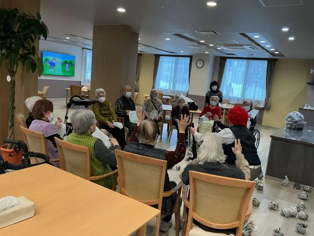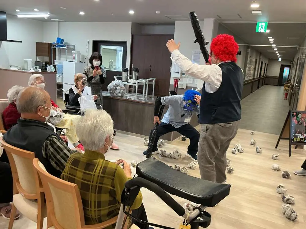 こんにちは!旭川9条通です(*^_^*) 2月3日に節分の豆まきを行いました。 皆さん御存じの節分の豆まきは、季節の変わり目に生じる邪気(鬼)を払い、無病息災を願う「追儺(ついな)」の行事です。「魔の目(魔目=まめ)」に豆をぶつけて「魔を滅する(魔滅=まめ)」という語呂合わせや、炒った大豆(福豆)をまいて鬼を追い出し、福を呼び込む風習です。 職員が鬼の面とかつらで鬼に扮して入居者の皆さんには鬼に豆をぶつける鬼退治レクリエーションを行い、季節の移り変わりをより強く実感していただきたく計画いたしました。 施設で本物の豆を使用した豆まきは、利用者様のケガや誤嚥の危険性があります。また撒いた豆を拾って食べることも衛生的に良くありません。今回の豆まきでは、新聞紙を丸めたボール状のものを豆に見立てて行いました\(゜ロ\)(/ロ゜)/ 参加された入居者の皆さんには「鬼は外、福は内」と皆さんで大きな声を出しながら鬼に豆をぶつけていただき、楽しい時間を過ごされました。 また施設には様々な要介護度の方が入居されていますのでその場に参加できなった方には鬼がお部屋に伺い豆まきを行い、季節を実感していただきました。 節分のレクリエーションを行い楽しい時間を過ごすことで、ストレスが発散されるだけでなく、運動不足を解消させることもできます。体を動かすことでセロトニンといったホルモンが分泌され、ストレスの解消や脳を活性化させる効果を得られます。またレクリエーションを通して笑ったり感情を高めることで、副交感神経が優位になり幸福感を感じるようになります。 このレクリエーションには、こういった心身のリフレッシュの目的もあるのです\(^o^)/ 次回も乞うご期待!!