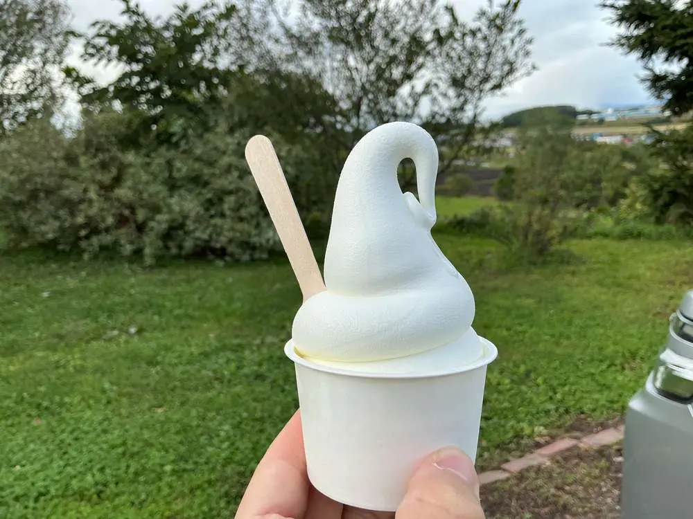 帰りには旭川空港すぐ、地元で有名なアイス屋さん、「アイス工房 田村ファーム Clover」のソフトクリームを食べました。