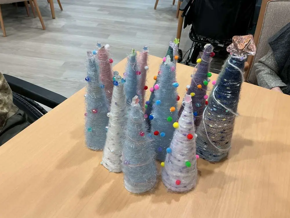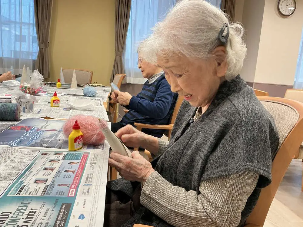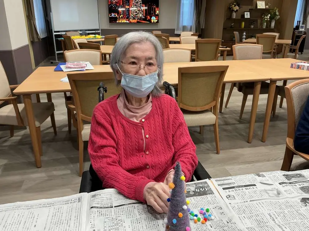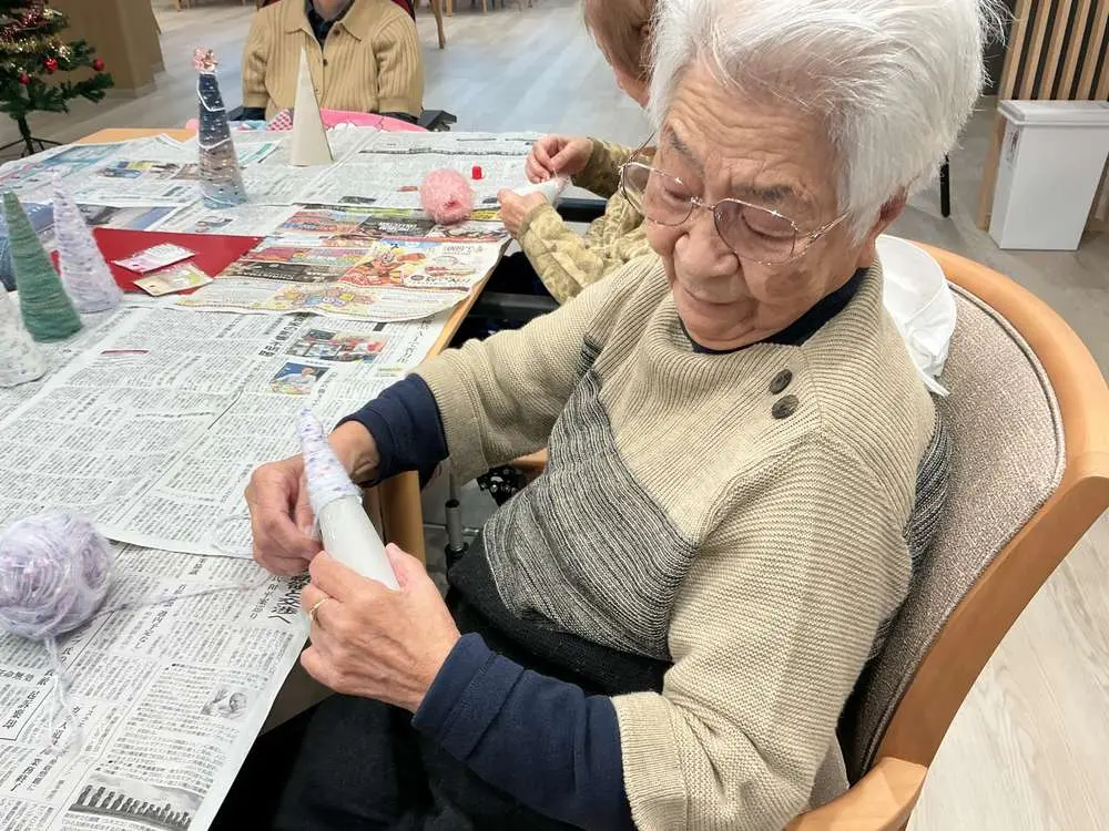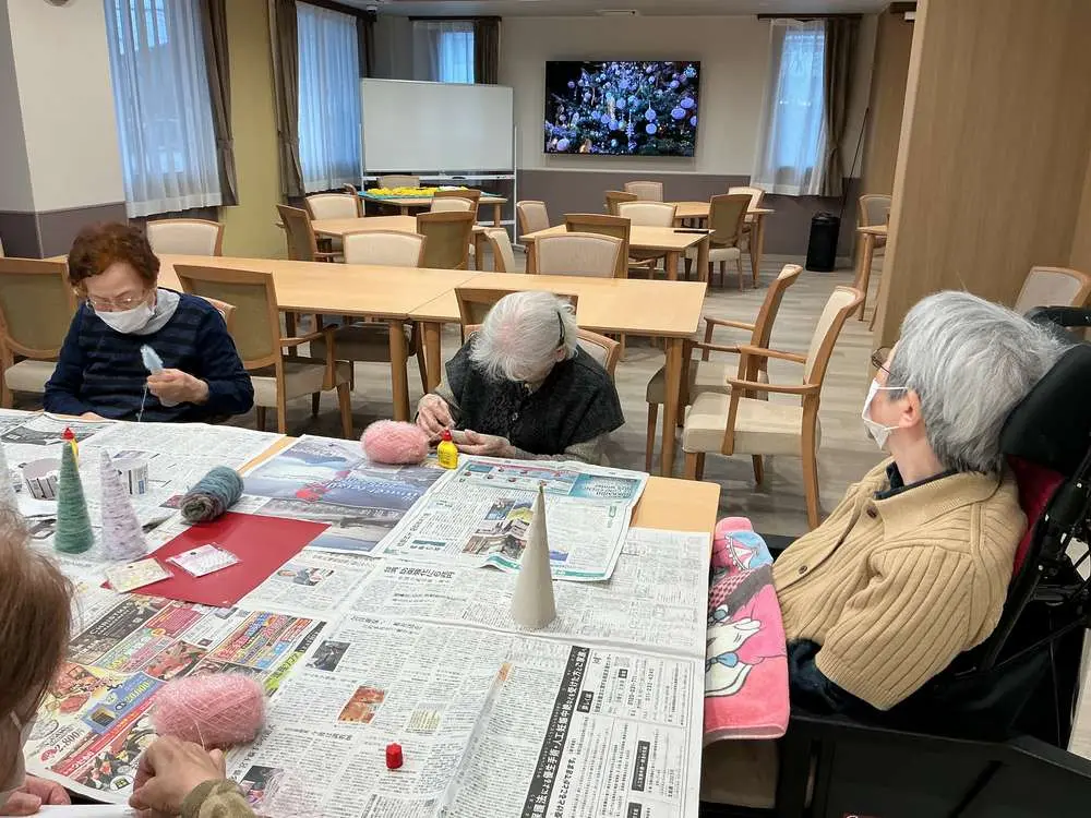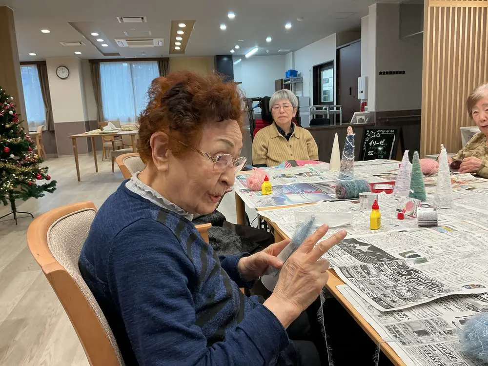 入居者の皆さんは自分好みの配色や飾り付けでオリジナルのクリスマスツリーを作成し楽しまれていました。この時期ならではの作品なので作成にも力が入り皆さん時間を忘れて作業に没頭されていました。