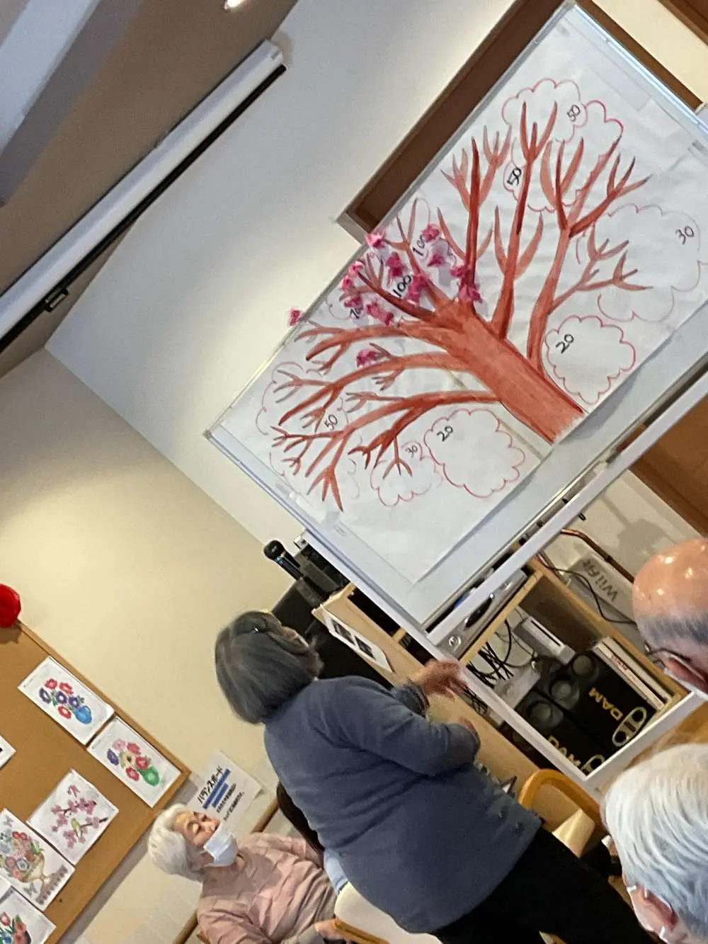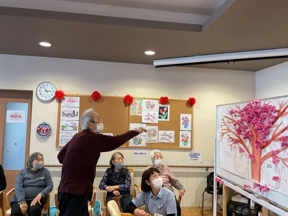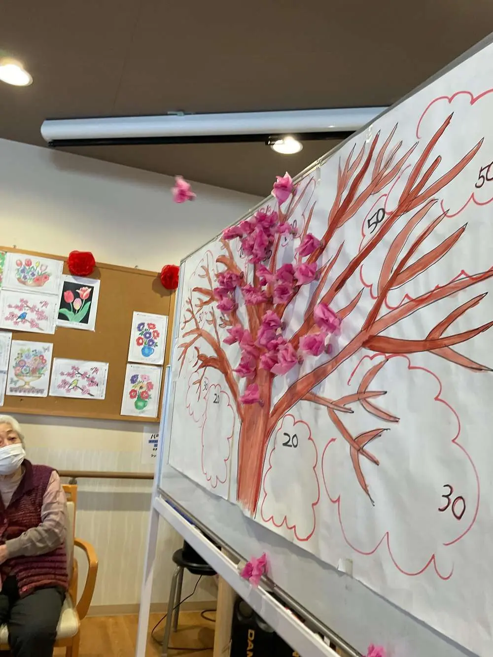 4月の曜日対抗ゲームは、デイサービスフロア内に桜を満開に咲かせるゲーム🌸