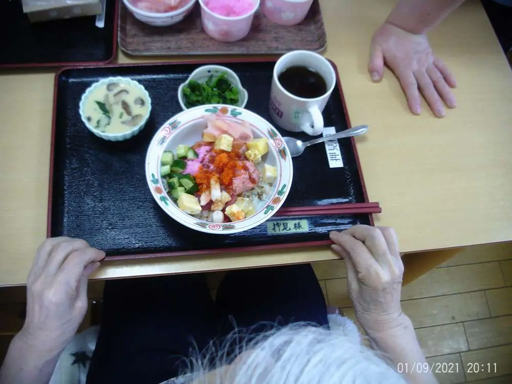 日々のコミュニケーションで「お寿司が食べたい」「お刺身が食べたい」との要望があり開催しました。春を感じる食べ物を調理して召し上がる。そして作る楽しみ、見る楽しみ、食べる楽しみを体験して「楽しい‼️」と思えるイベントとなりました😄具材も盛りだくさんで幸せなひと時を過ごすことができました。盛りだくさんの丼になり、幸せな気分でした🥰💕おやつにいちごを載せたデザートを美味しくいただきました🍓