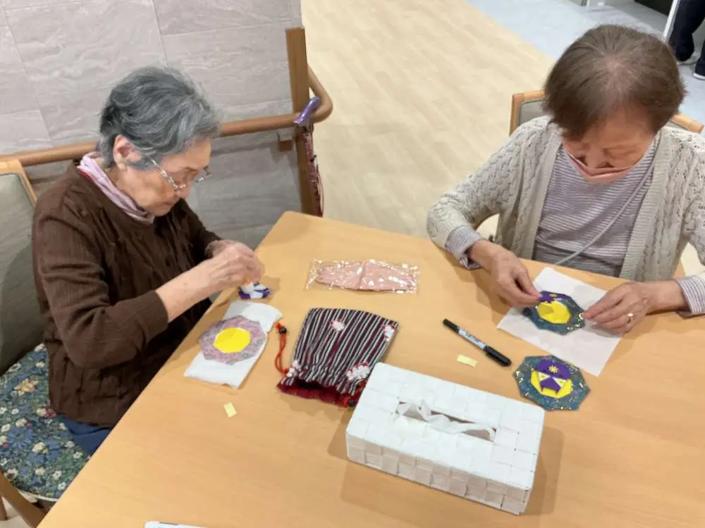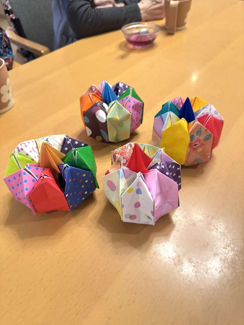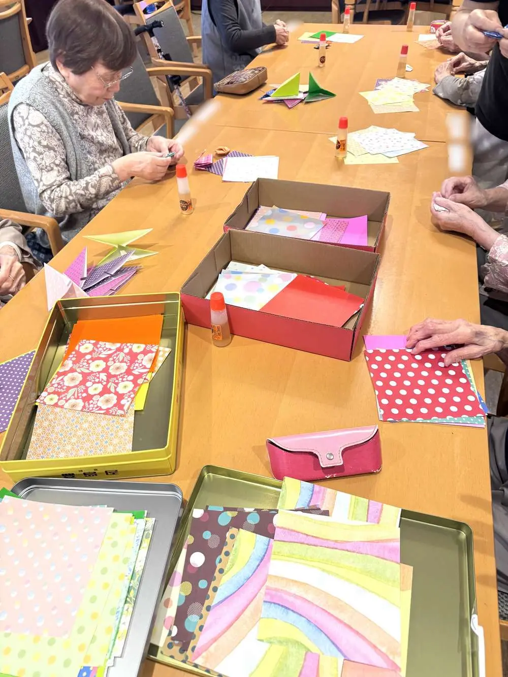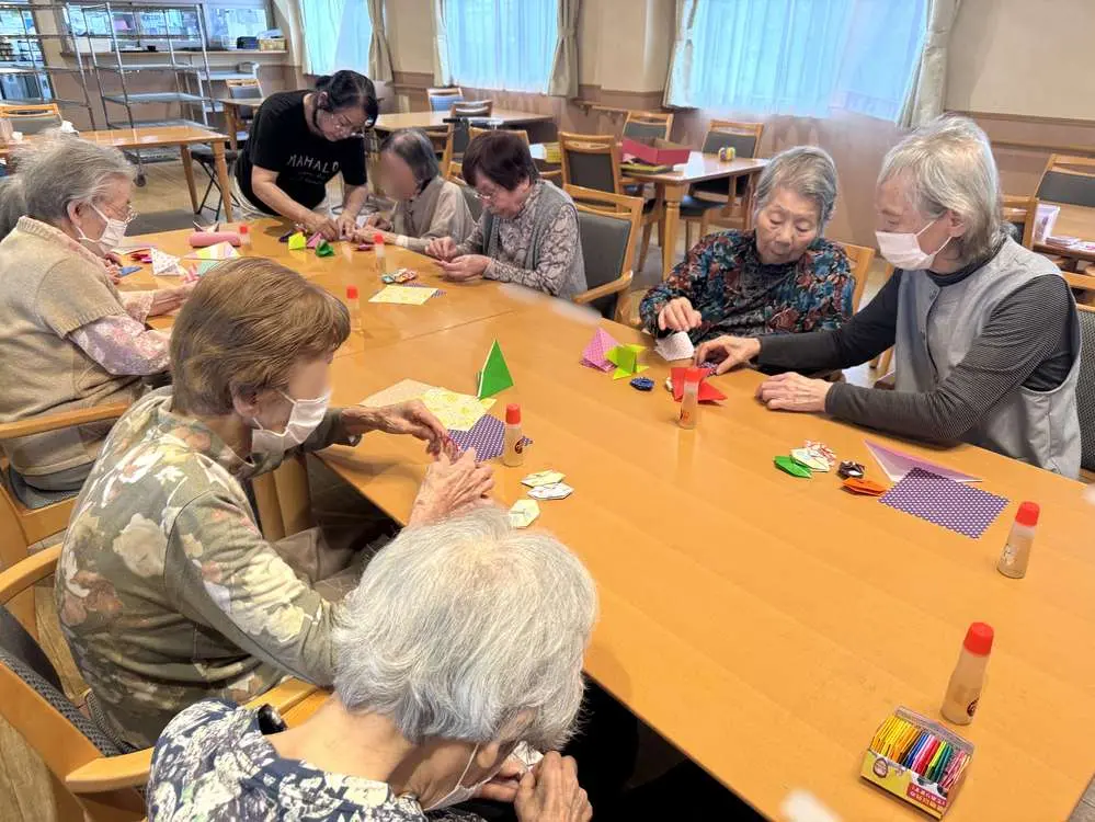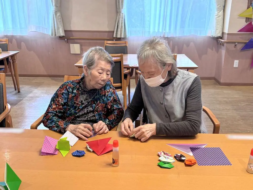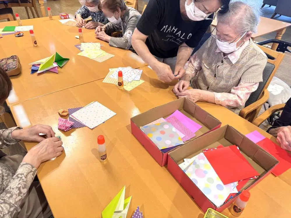 カラフルな紙を広げるところから始まり、折ったり、糊で貼り合わせたりと、一つひとつの工程に集中しながら取り組まれる姿がみられました😊
