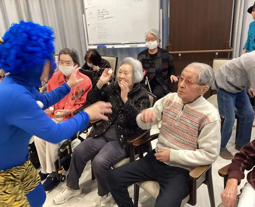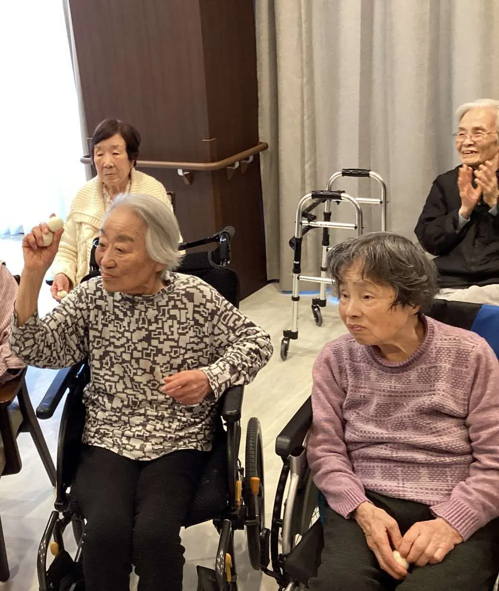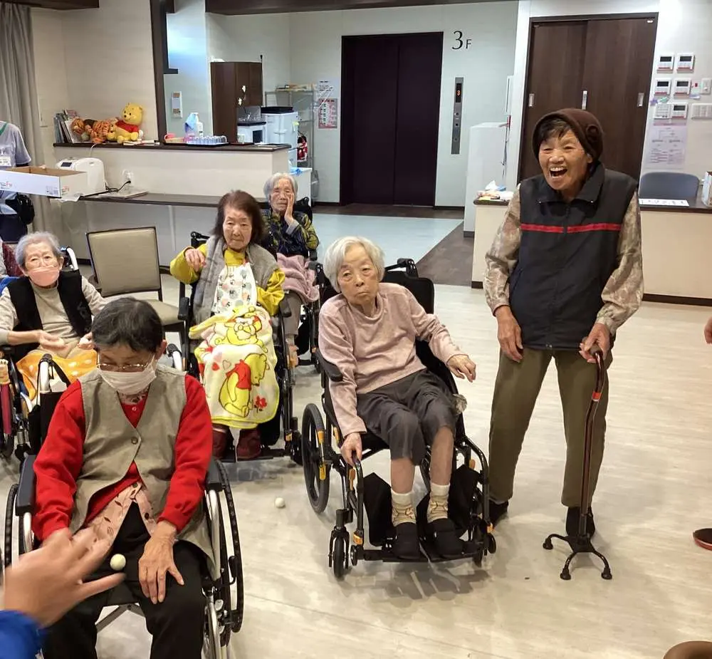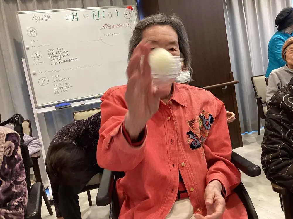 職員が鬼に扮して入居者様の前に現れると、入居者様鬼をめがけて一斉に豆の代わりのボールを