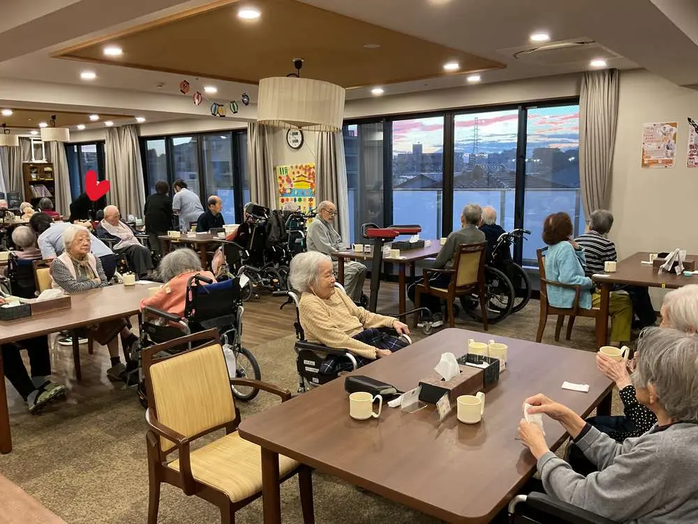 大きな窓いっぱいに広がる夕焼けが、部屋の中までオレンジ色に染めてくれて、まるで絵本の中にいるような景色に「わぁ、きれい」「毎日こんな夕日が見られたらいいのにね」と皆さま笑顔がこぼれて、穏やかな空気が流れていました🧓👴