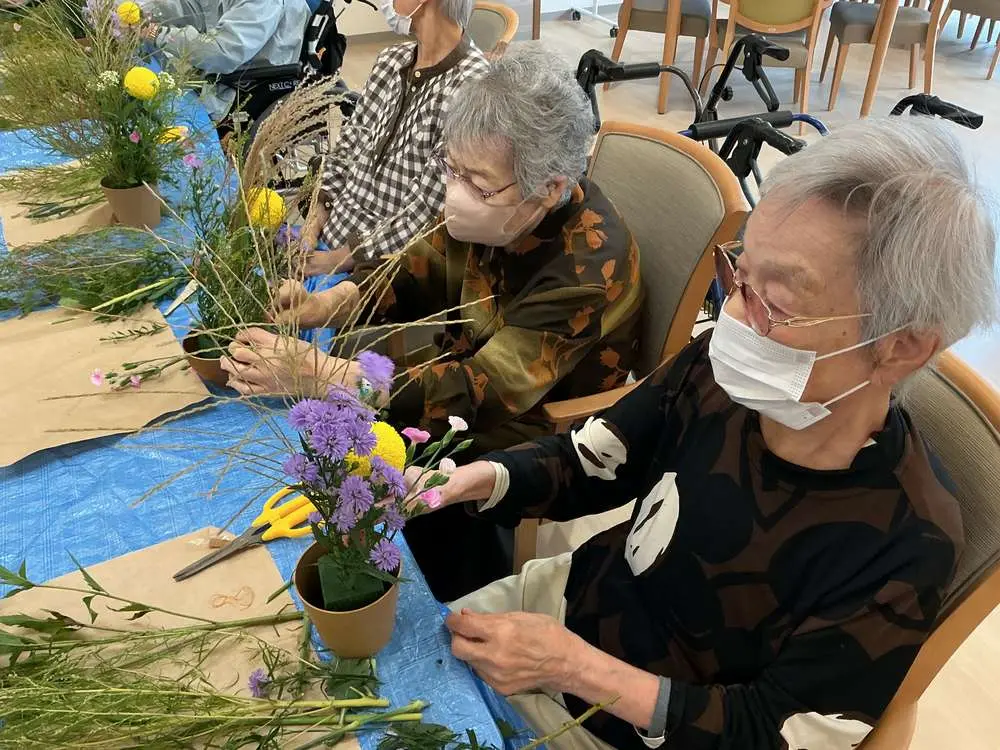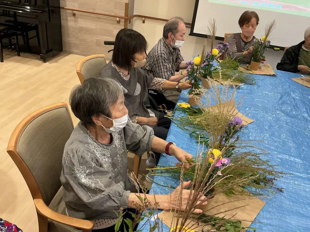 ススキや菊、リンドウなど、秋🍂を感じる草花を前に皆さま真剣な表情で花材を手に取り、色合いや高さのバランスを考えながら丁寧に活けていらっしゃいました😄