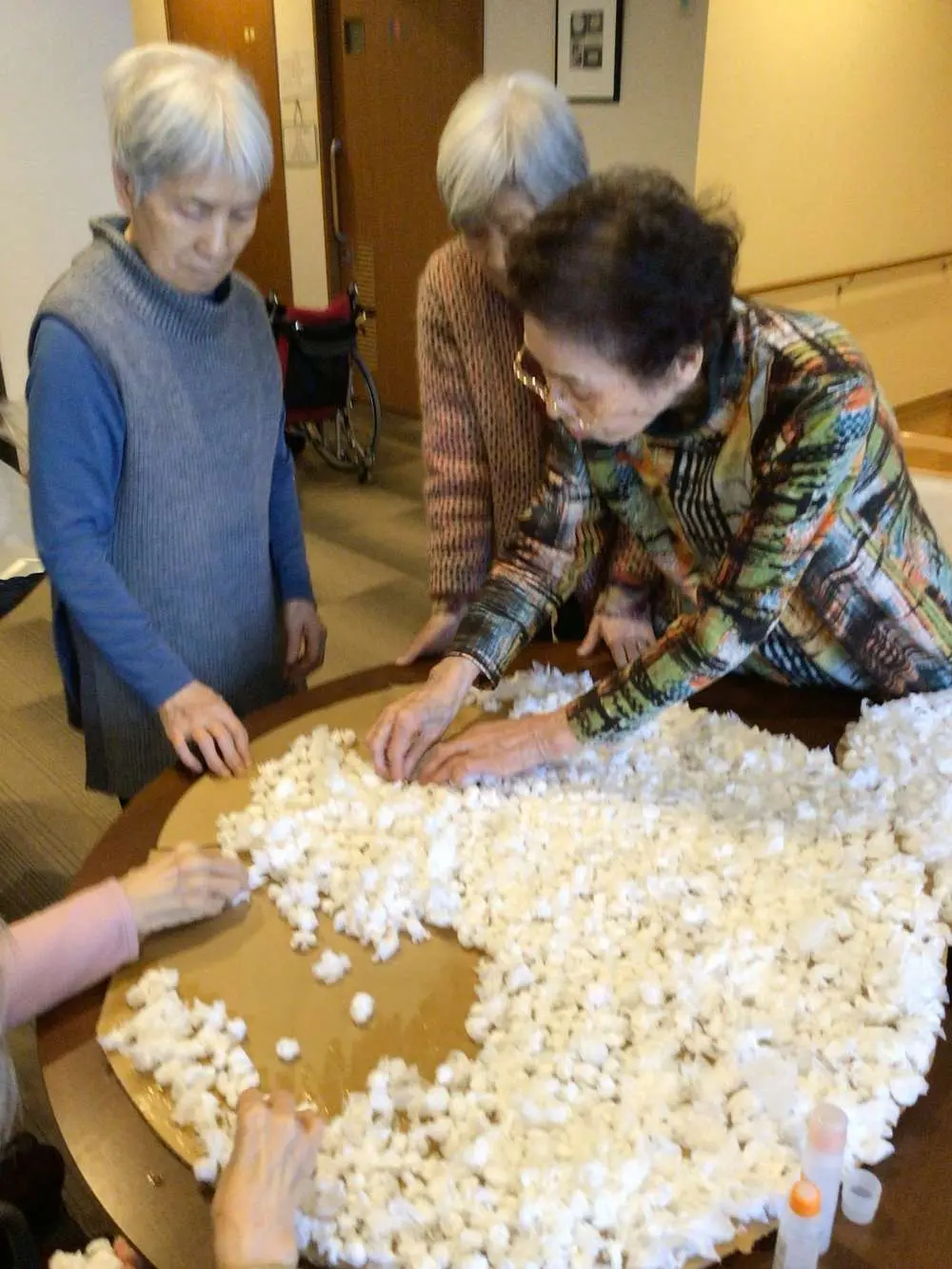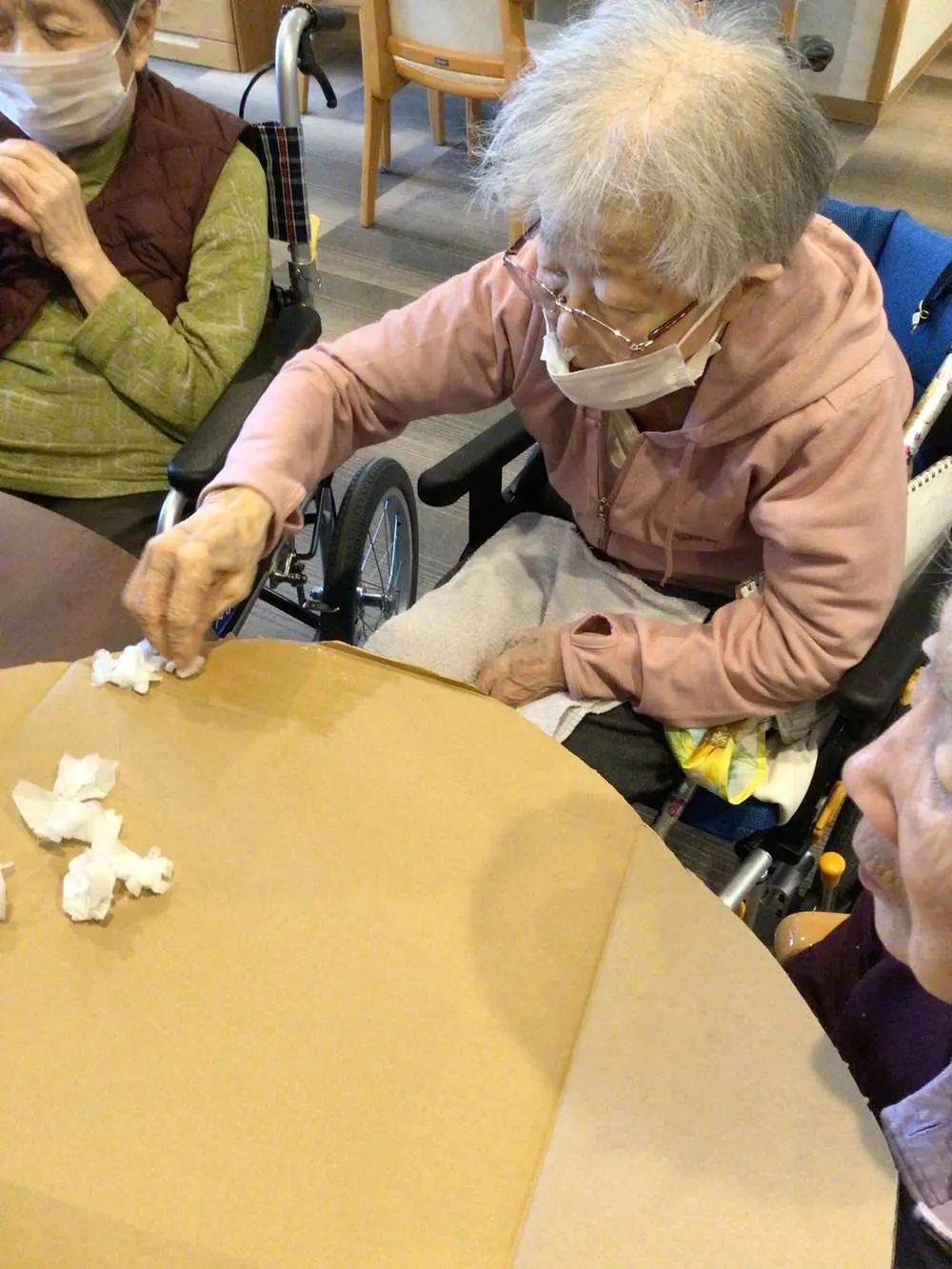 懐かしい紙風船をうちわで扇ぎ、何人の人に風船を渡せるかというレクです。皆さん経験したことのある動きだと、身体がスムーズに動くということを私改めて学びました。いつもと違う一面を見ることができて感動しました。