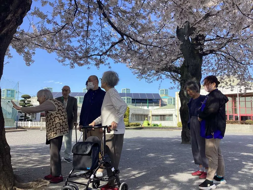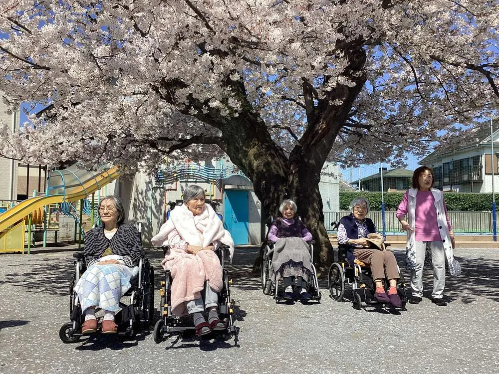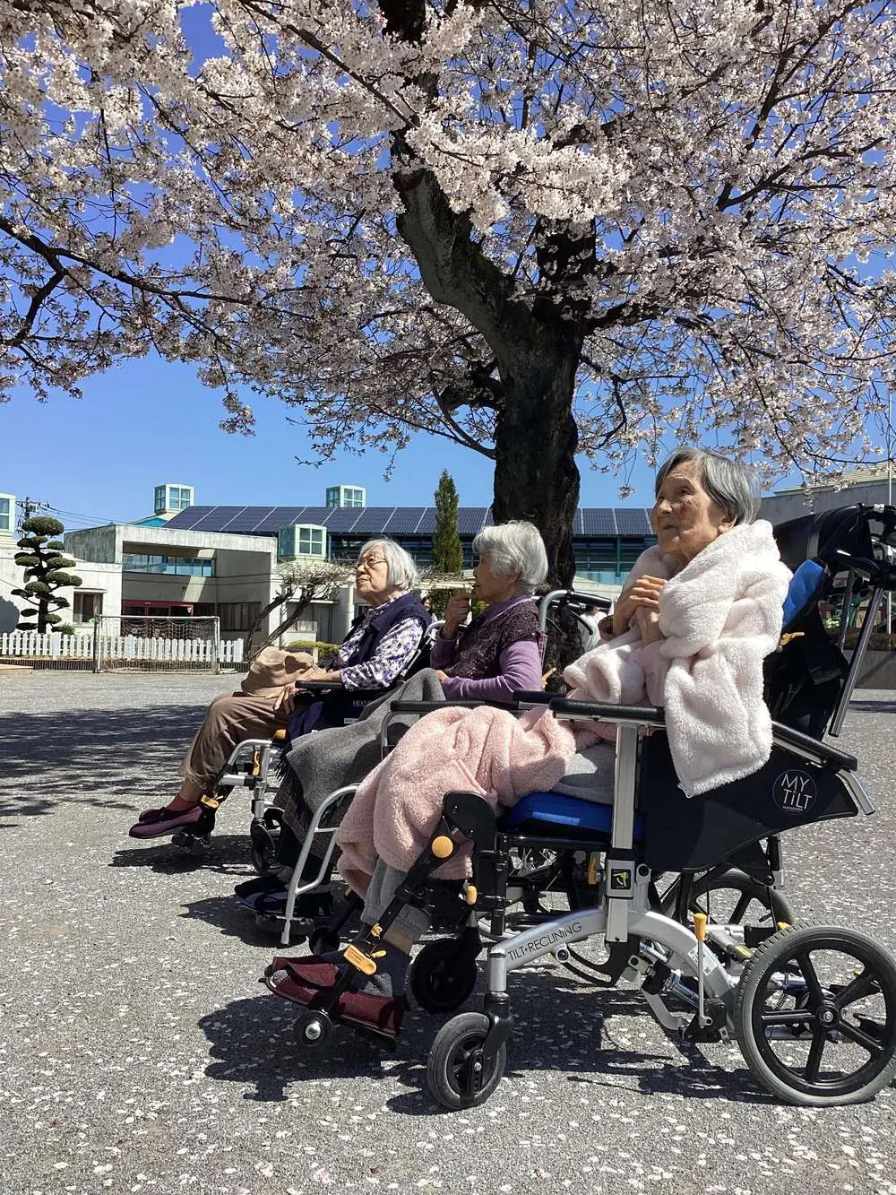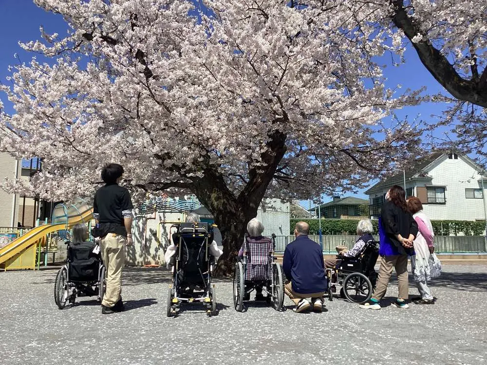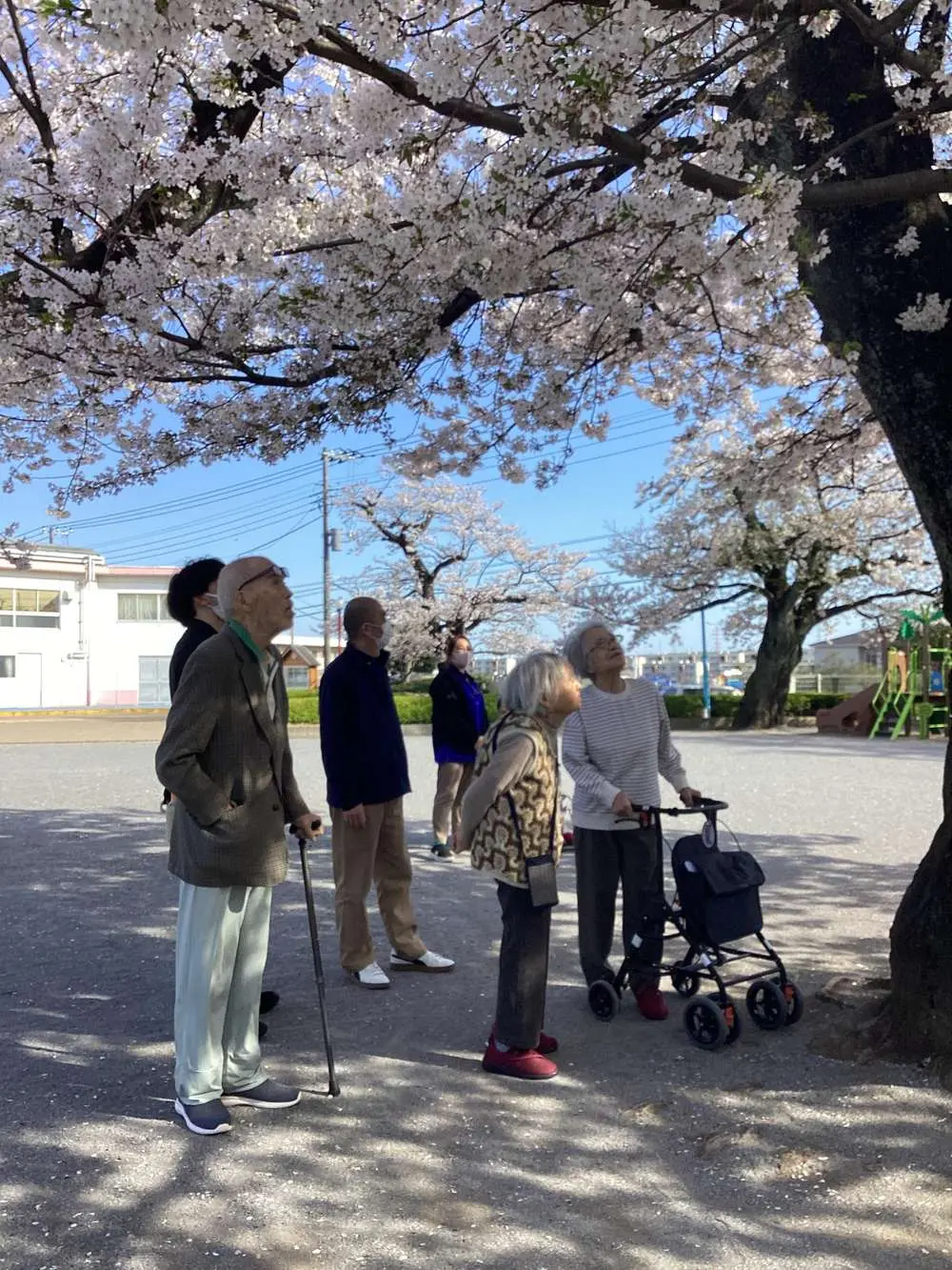皆さんこんにちは。イリーゼ流山はついしです。今回はお花見の様子をお伝えします。雨の日が多く、行える日が『今日しかない』という日でした。しかしお風呂もある・事務所スタッフも受診がある・他職種にも協力が必要でした。そんな中、看護スタッフが『もしやるなら全力で手伝います』と言って下さり、我々事務所スタッフの迷いも消え、お花見を行う事ができました。