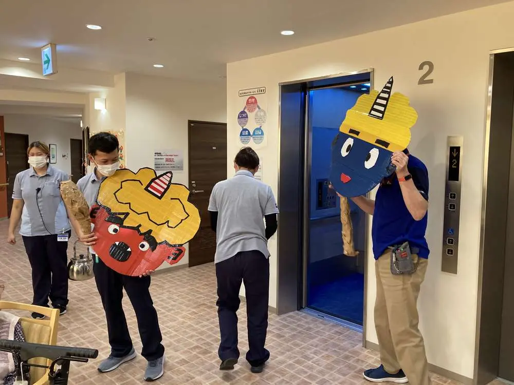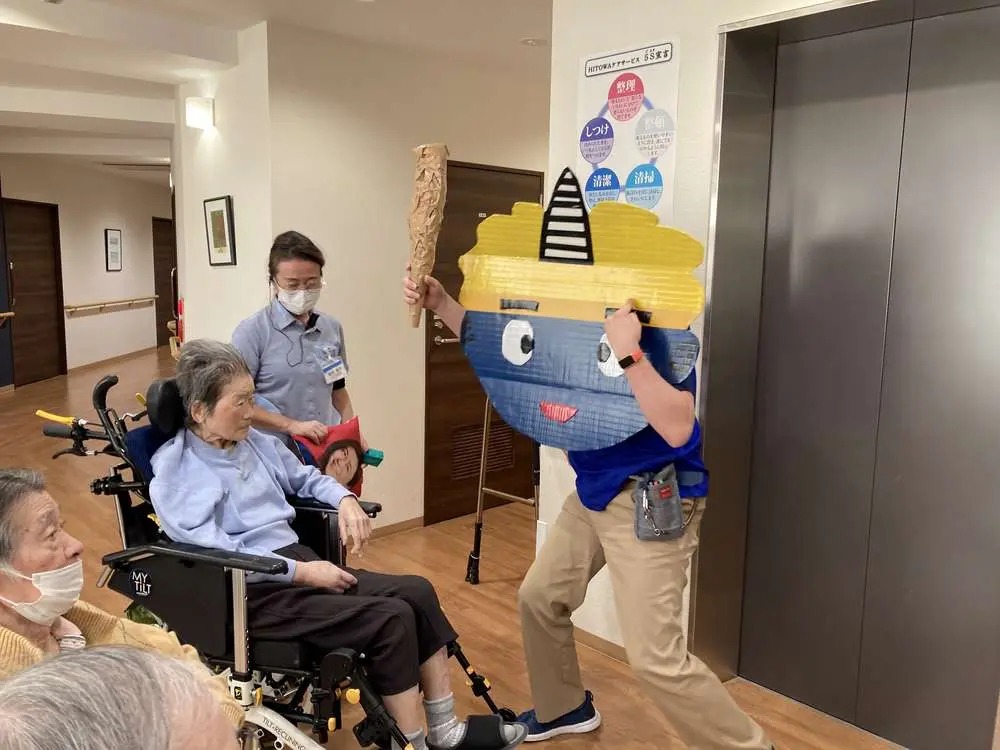 入居者の皆様も最初は驚いていましたが・・・手渡された「豆」を持ち鬼に勢い良く投げつけている姿