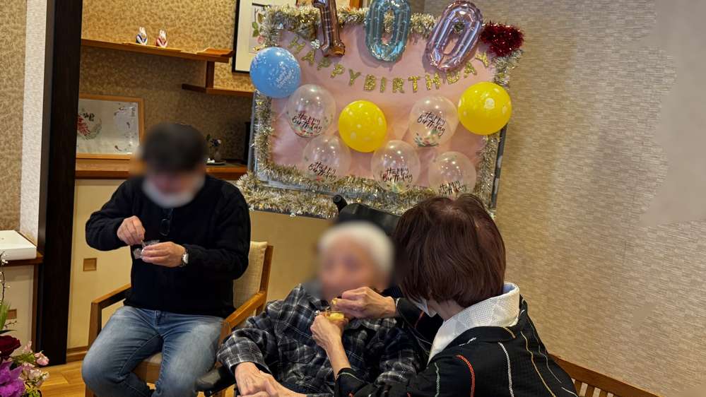 スタッフの手作り装飾と、ご家族の愛が詰まった音楽♬とプリン。みんなの「おめでとう」が静かに重なり合った、最高に素敵な100歳の一日となりました。