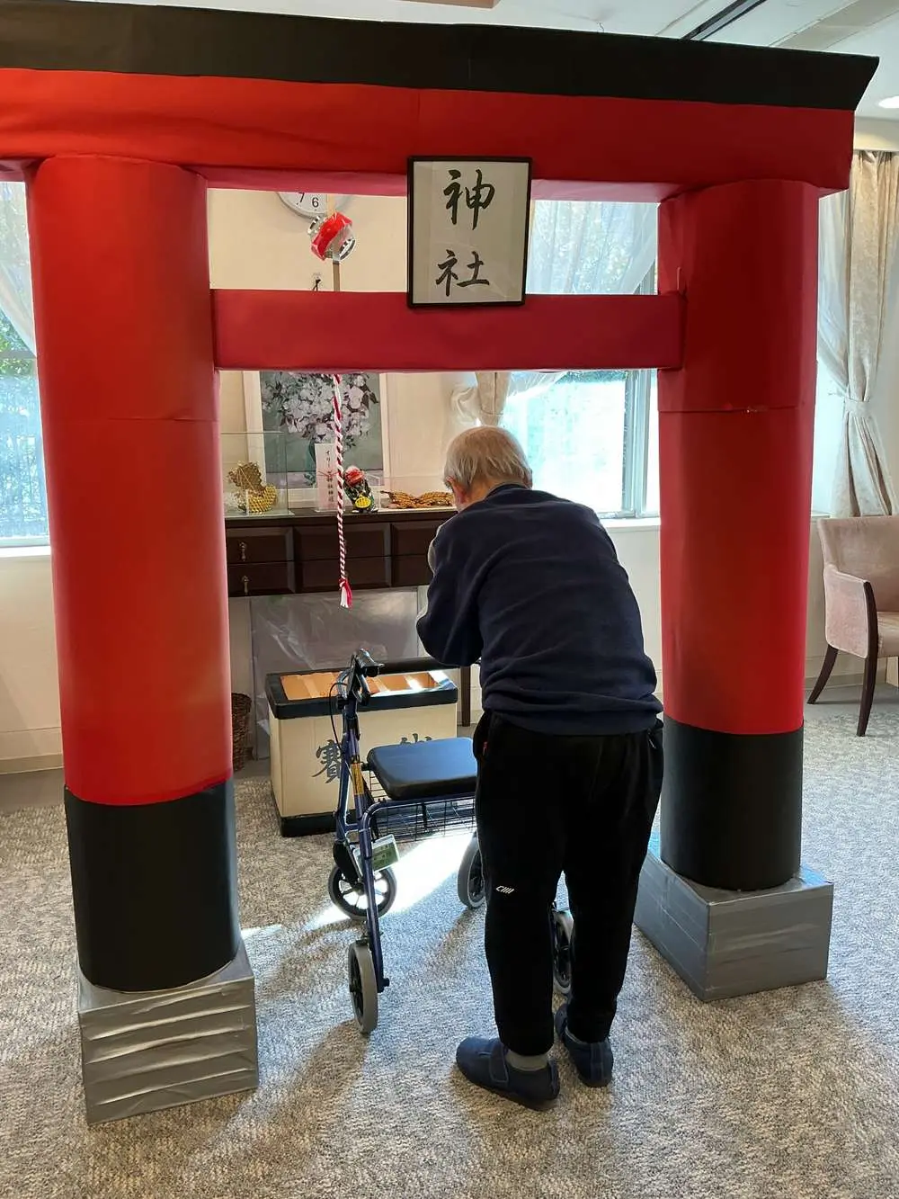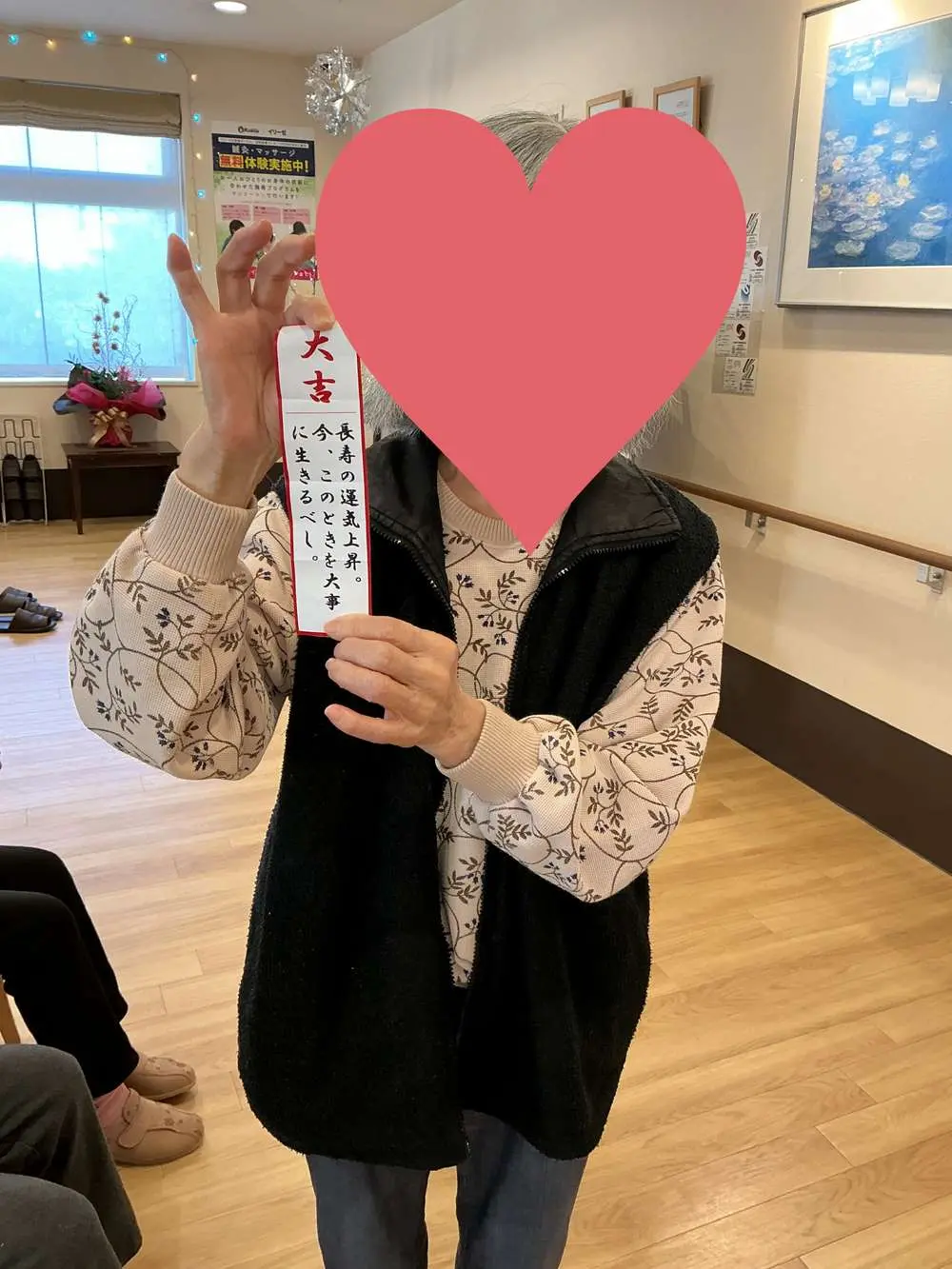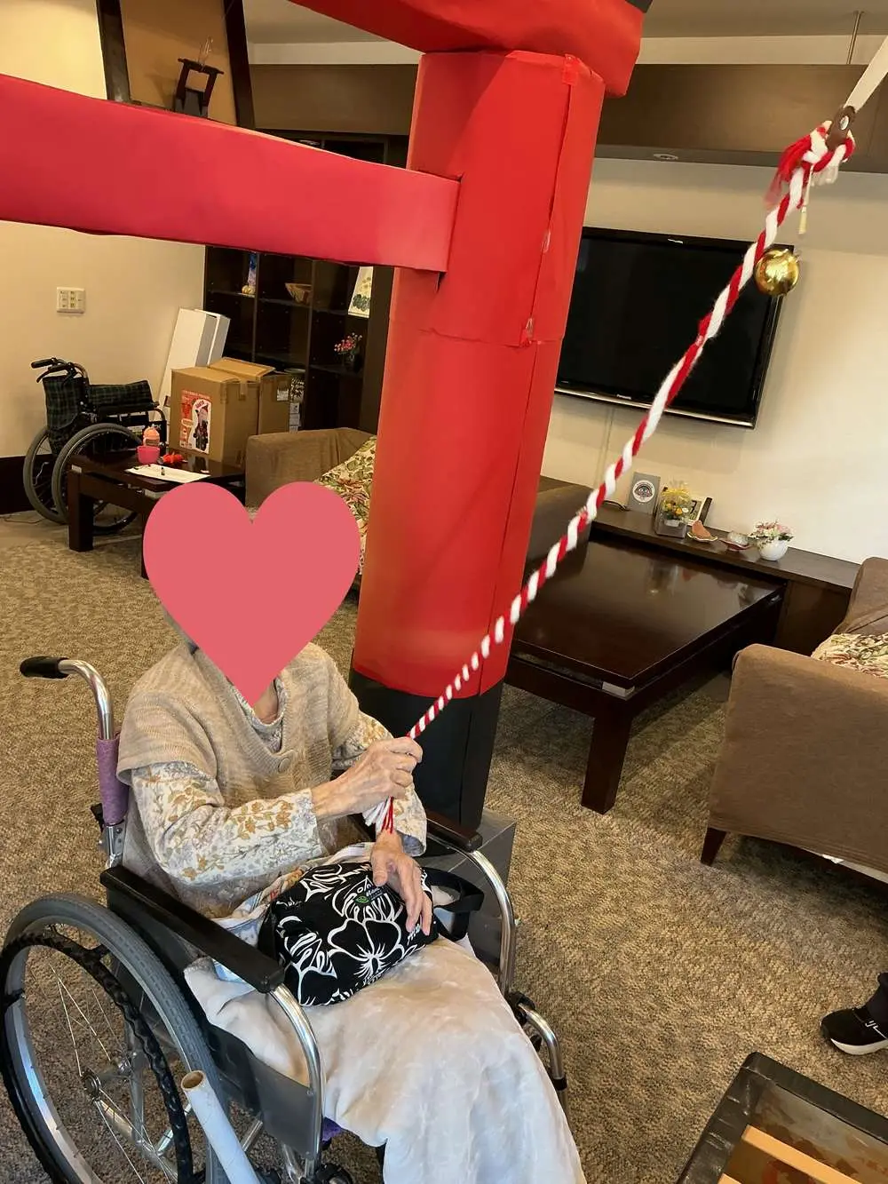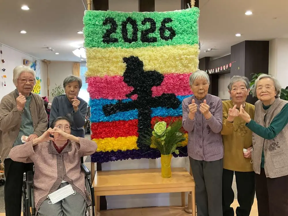 今回のブログでご紹介している写真は、お正月の壁面掲示物です。 実はこれ、入居者の皆さまとスタッフが力を合わせ、約半月もかけてコツコツと作り上げた大作なんです!