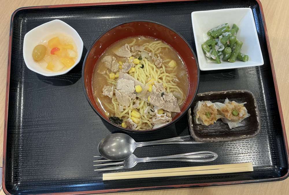 以前から飾っていた「桜のタペストリー」の上にこの藤の花を飾ったことで、食堂前はまさに百花繚乱! ピンクと紫のコントラストが美しく、ホームの中がパッと明るくなりました。