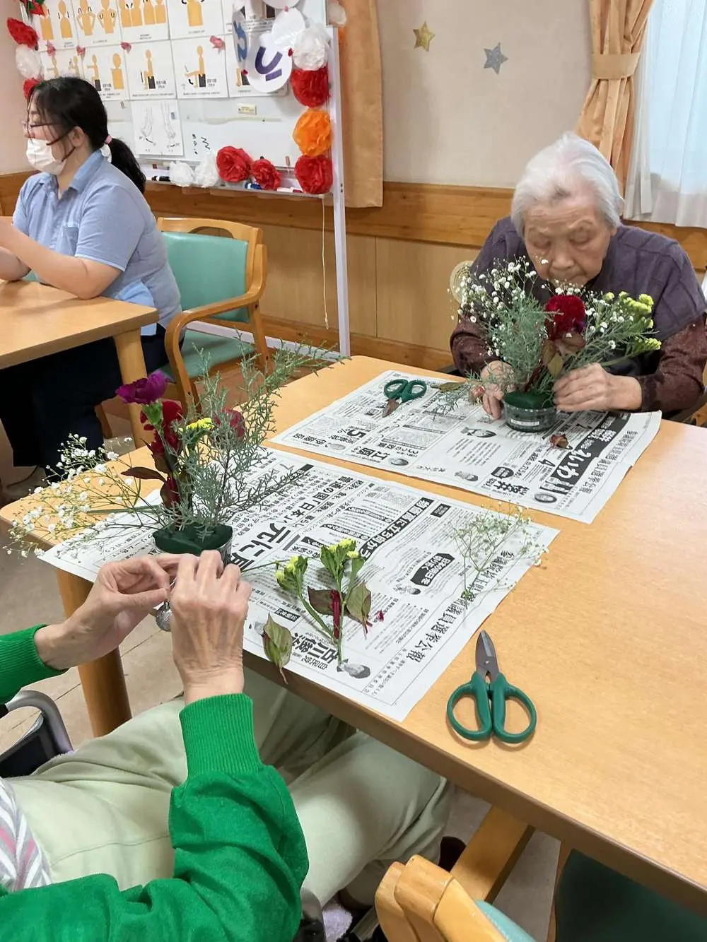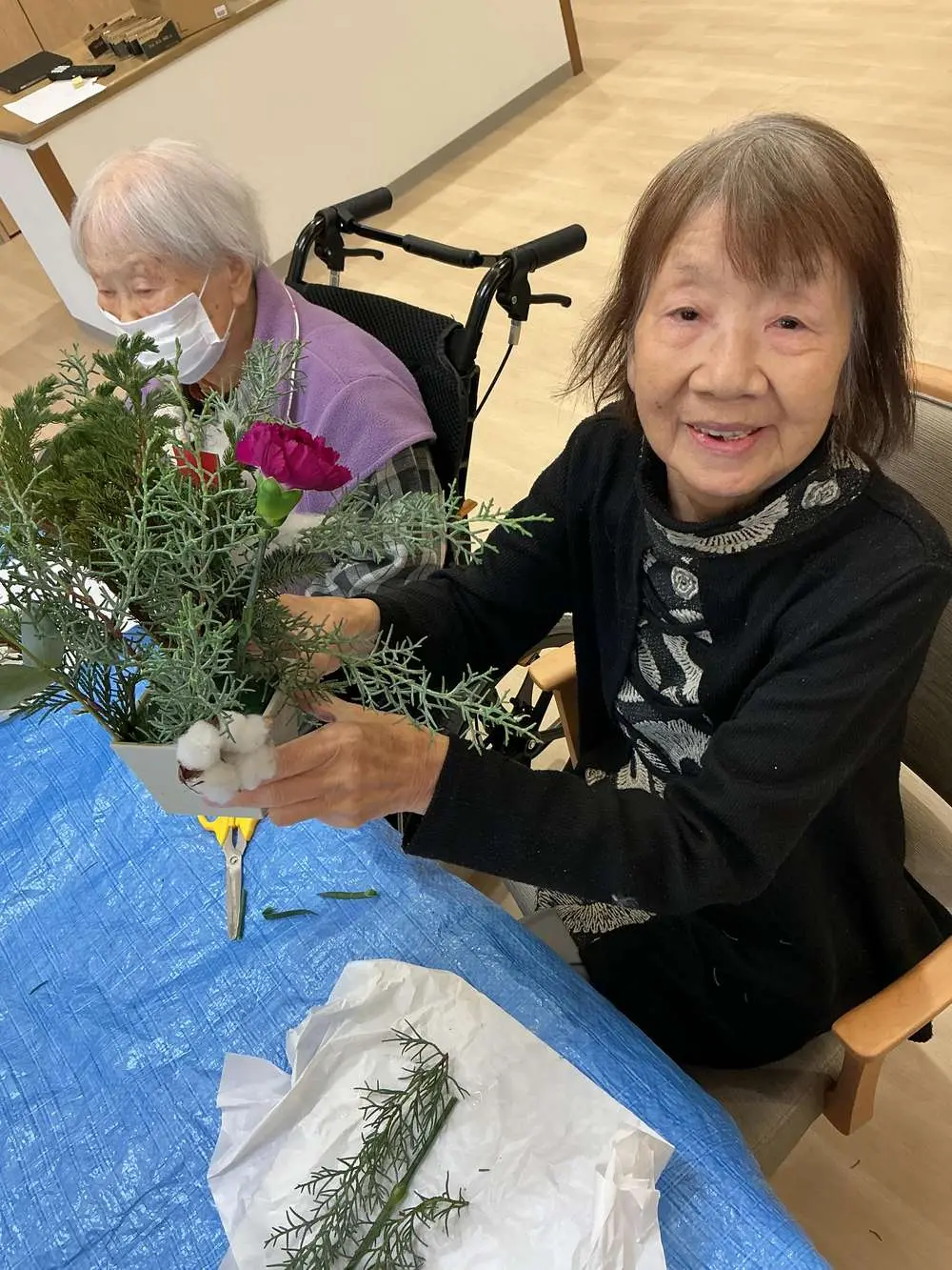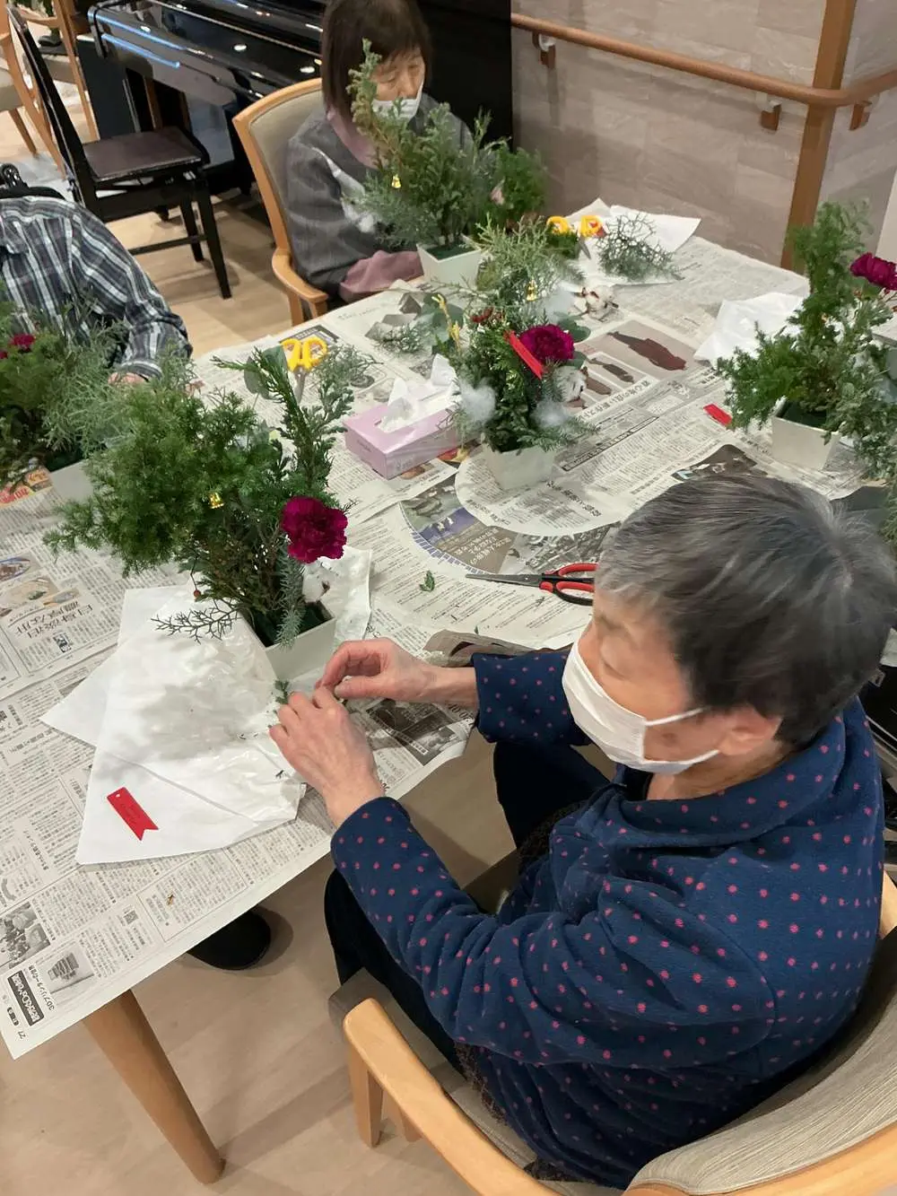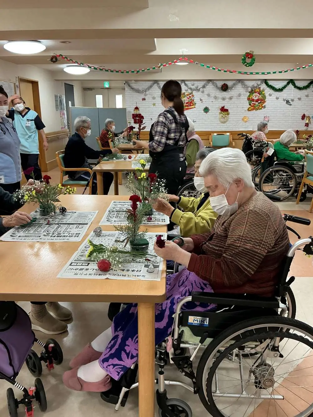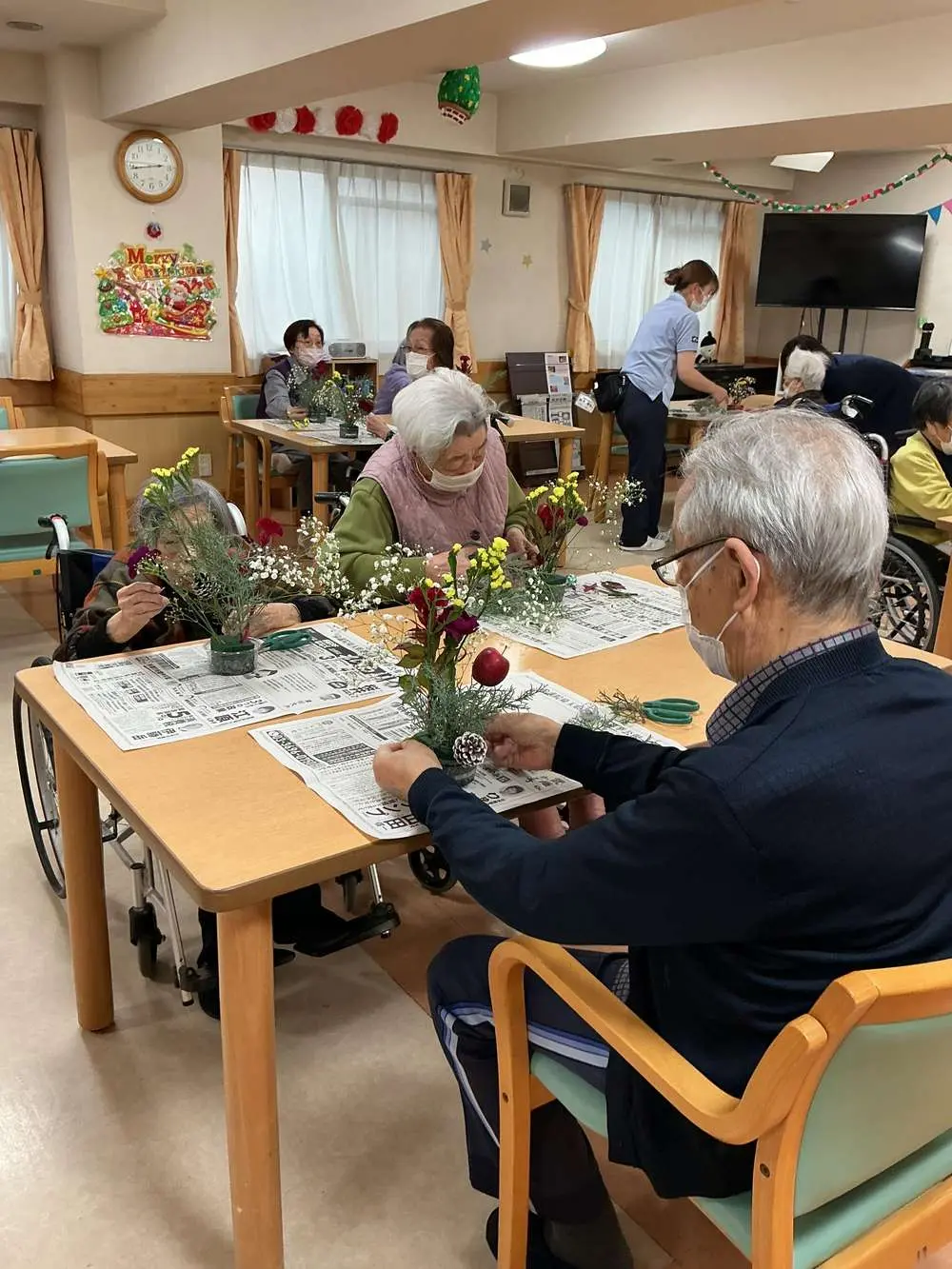 季節行事を取り入れたフラワーアレンジメントを通して、指先の運動や気分転換につながるとともに、心温まるひとときを過ごしていただくことができました🎅