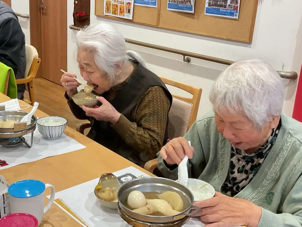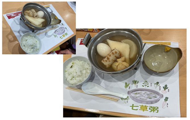 七草をご紹介したランチョンマットを見ながら「七草、全部言えるかな?」とお席の方々と談笑されたり、「熱々のおでんで体も温まって、お粥のお替りも出来ないくらいお腹いっぱいだよ~」などの声も聞かれました(^^)v 胃腸を休ませられてはいないかもしれません… 季節を感じる美味しい楽しい昼食時間となりました♪