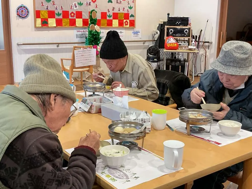 デイサービスでも1/7の昼食に【七草粥】をご用意、卓上コンロで熱々のおでんと共に召し上がって頂きました(^^)/