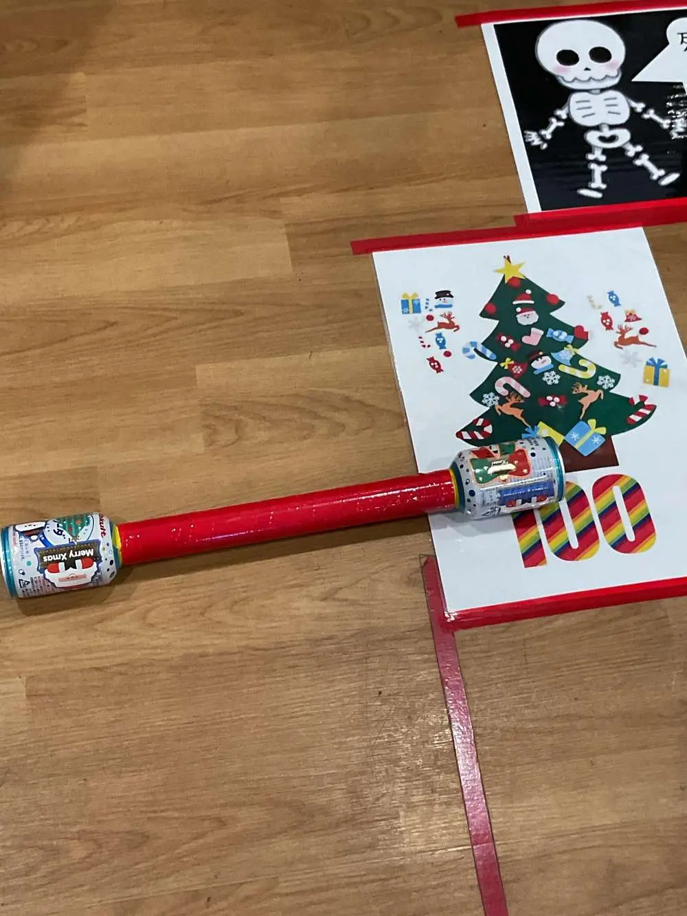 空き缶が両端に付いた棒を蹴り、得点を狙っていきます🎄