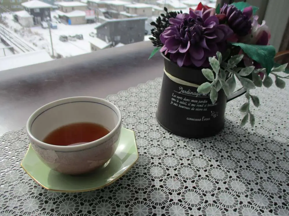 窓際では、温かいお茶の湯気と可愛らしいお花が、皆様の目と心を癒してくれています。