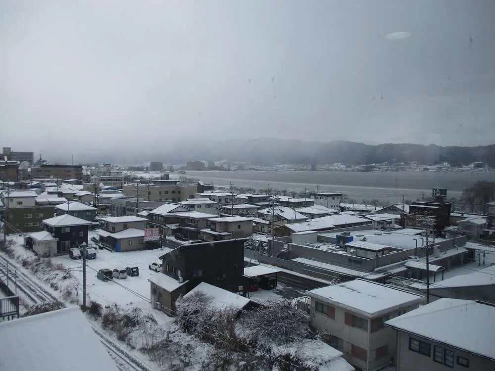 施設5階の窓から見下ろす諏訪湖は、まるで真っ白なキャンパスのよう。