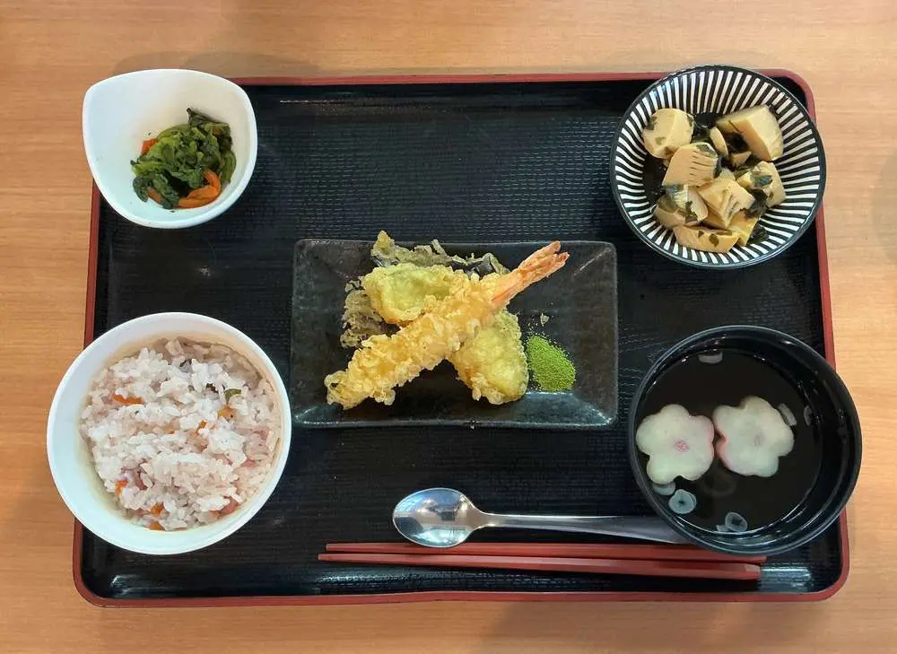 桜ごはん・春の天ぷら・若竹煮・菜の花のお浸し・すまし汁