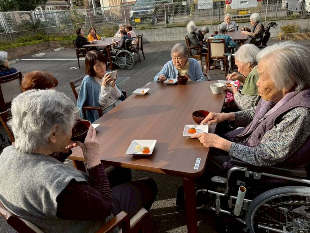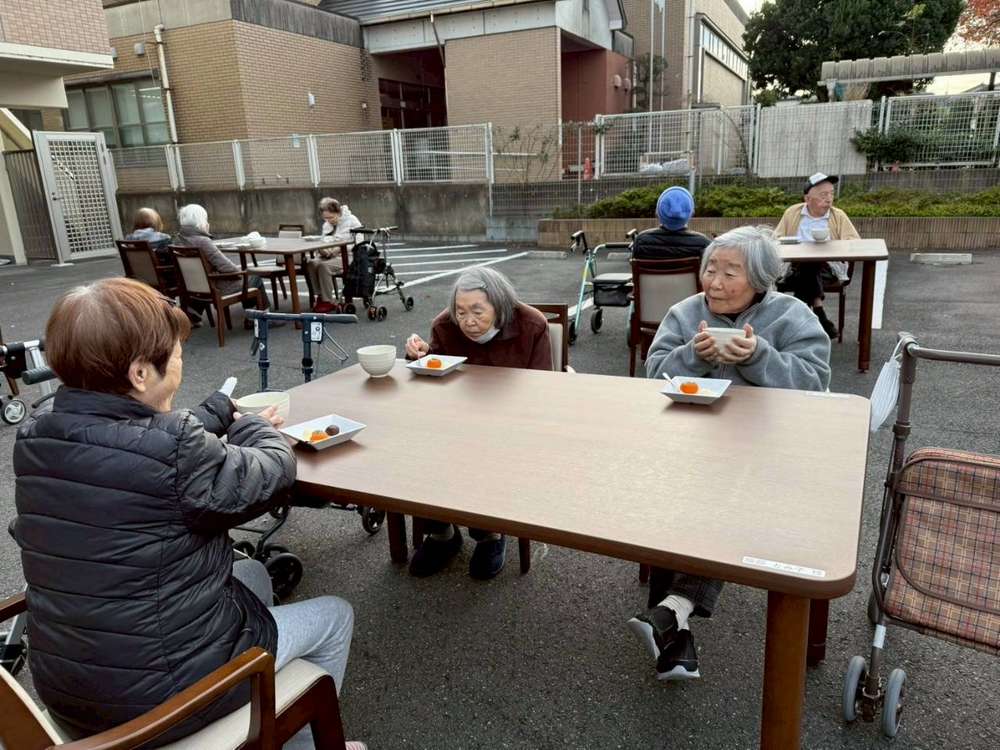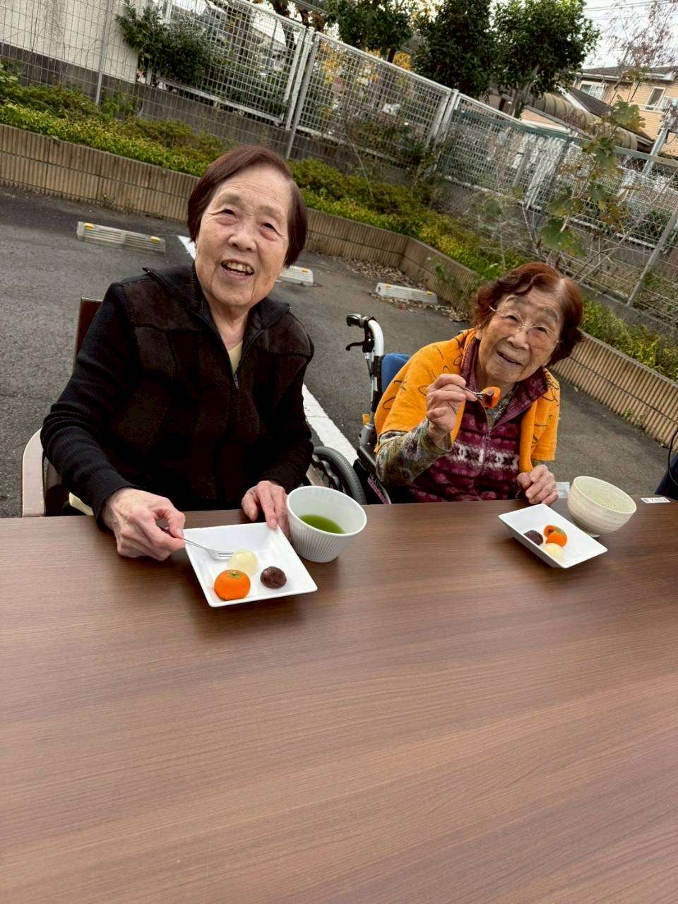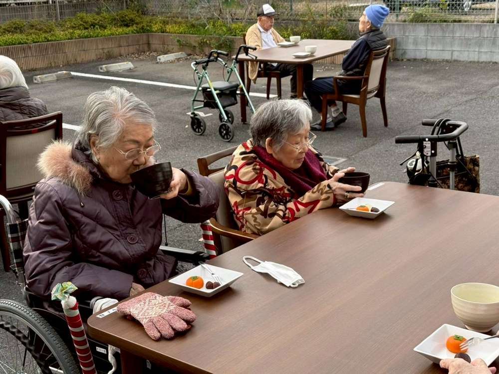 当施設の玄関前にお集まりいただいて、お抹茶とお茶菓子を召し上がって頂きました。