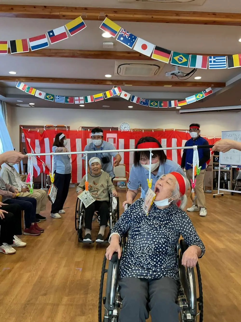 川越南古谷デイサービスのパン食い競争は、皆さまに車イスに乗って頂き、職員が後ろから押しながら協力し行うものです。