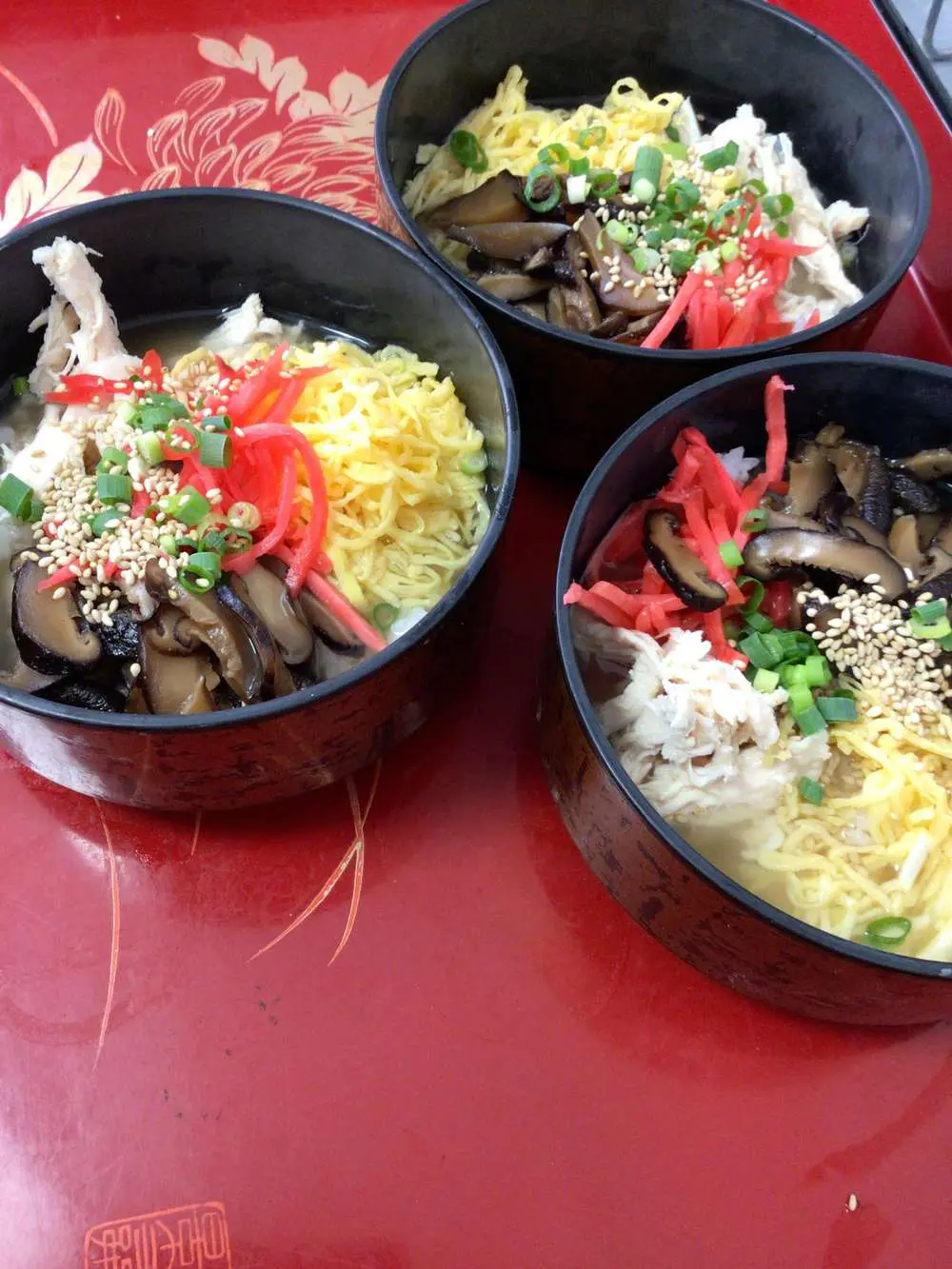 ご飯の上に鶏肉、錦糸卵、椎茸、漬物などを乗せ、熱い鶏ガラスープをかけてお茶漬けのようにして食べる料理です。 本場奄美大島では、おもてなし料理としても親しまれていそうです。