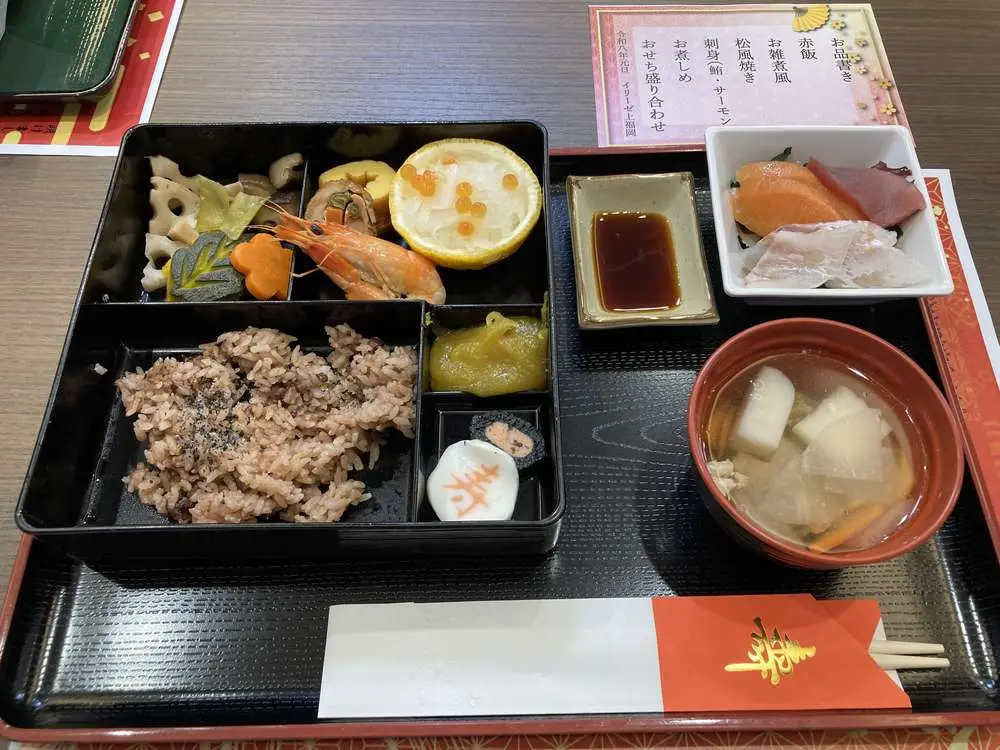お雑煮は、高齢者にも安心の歯茎でも潰せるべたつかないお餅を使用し、関東風の味付けで鶏肉大根人参が入った本格派です。