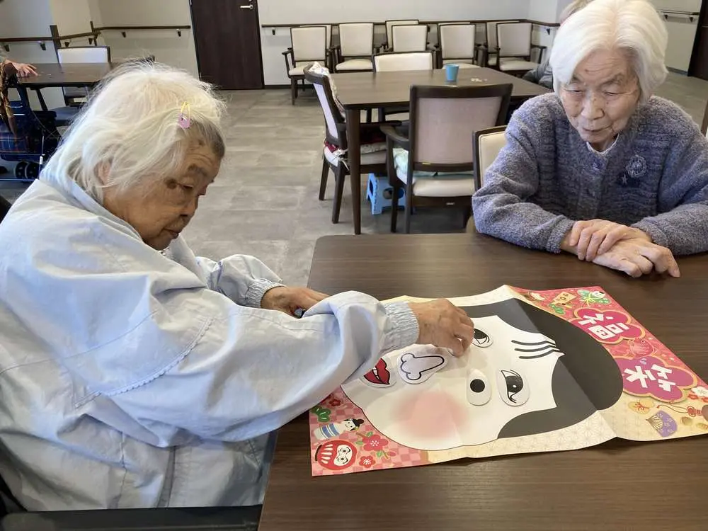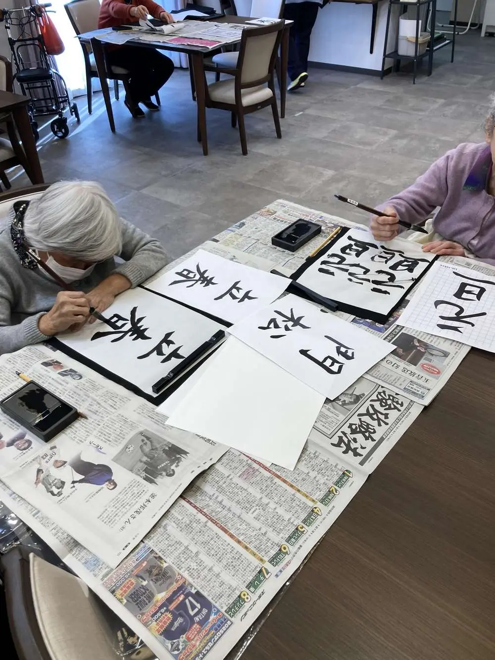 三が日には、お正月遊びで書初めや福笑い、おはじき遊びを楽しんでいただきました。