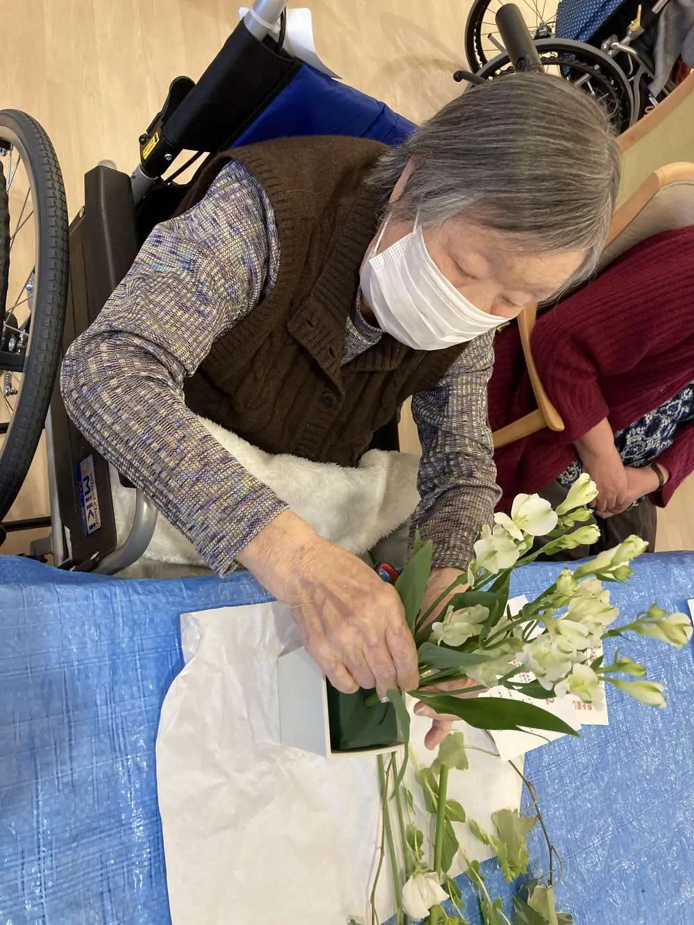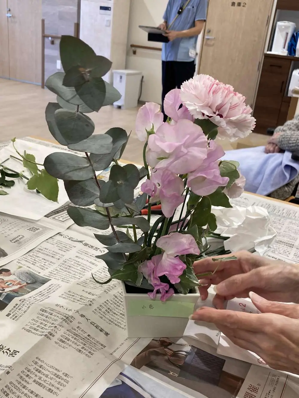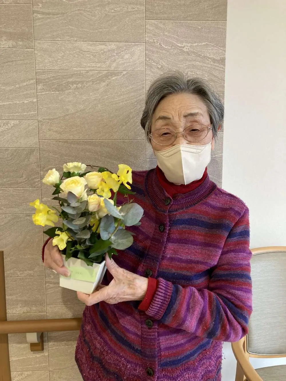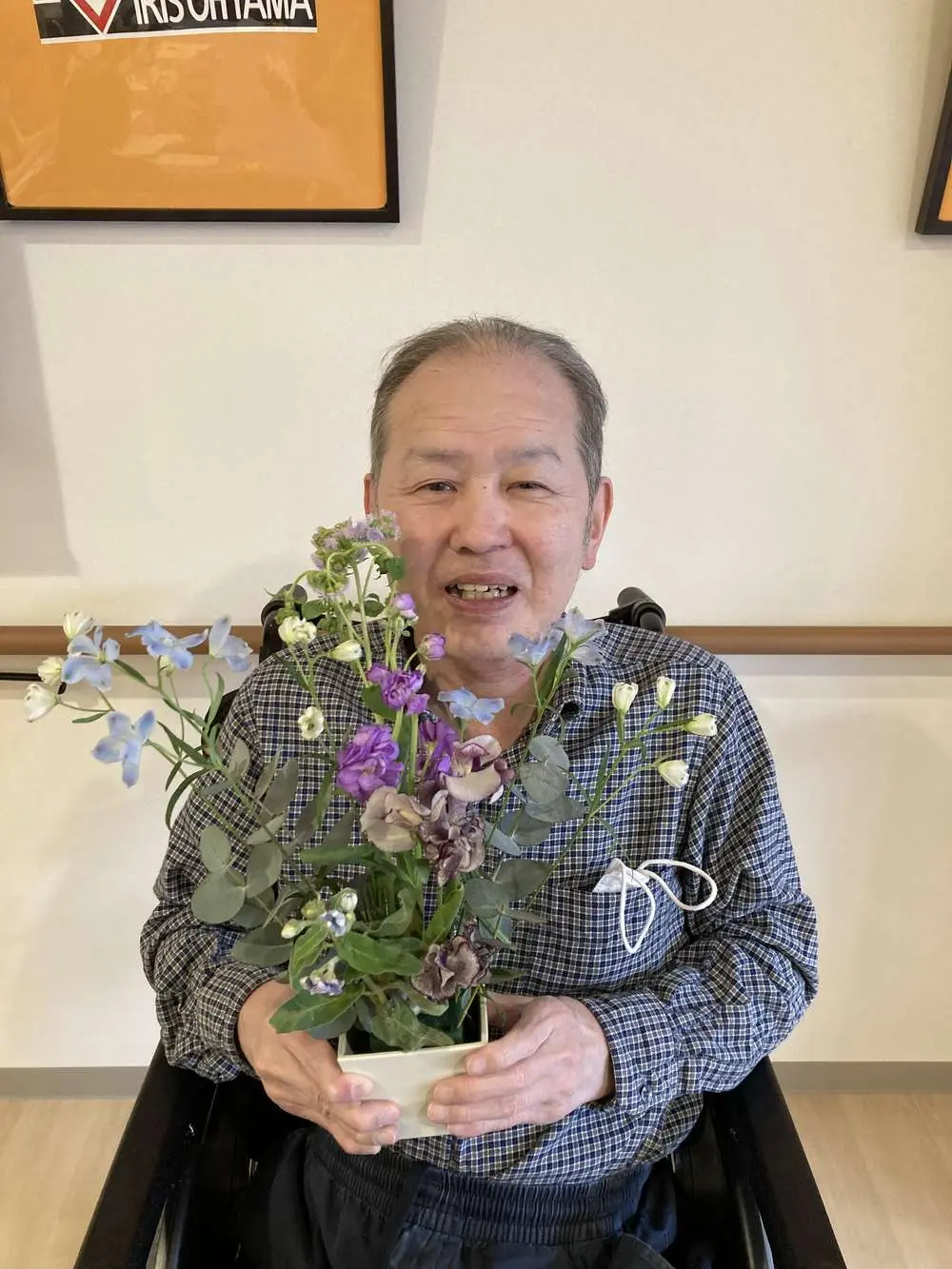 お客様がデイサービスで制作したアレンジメントに、綺麗に咲いたチューリップが🌷