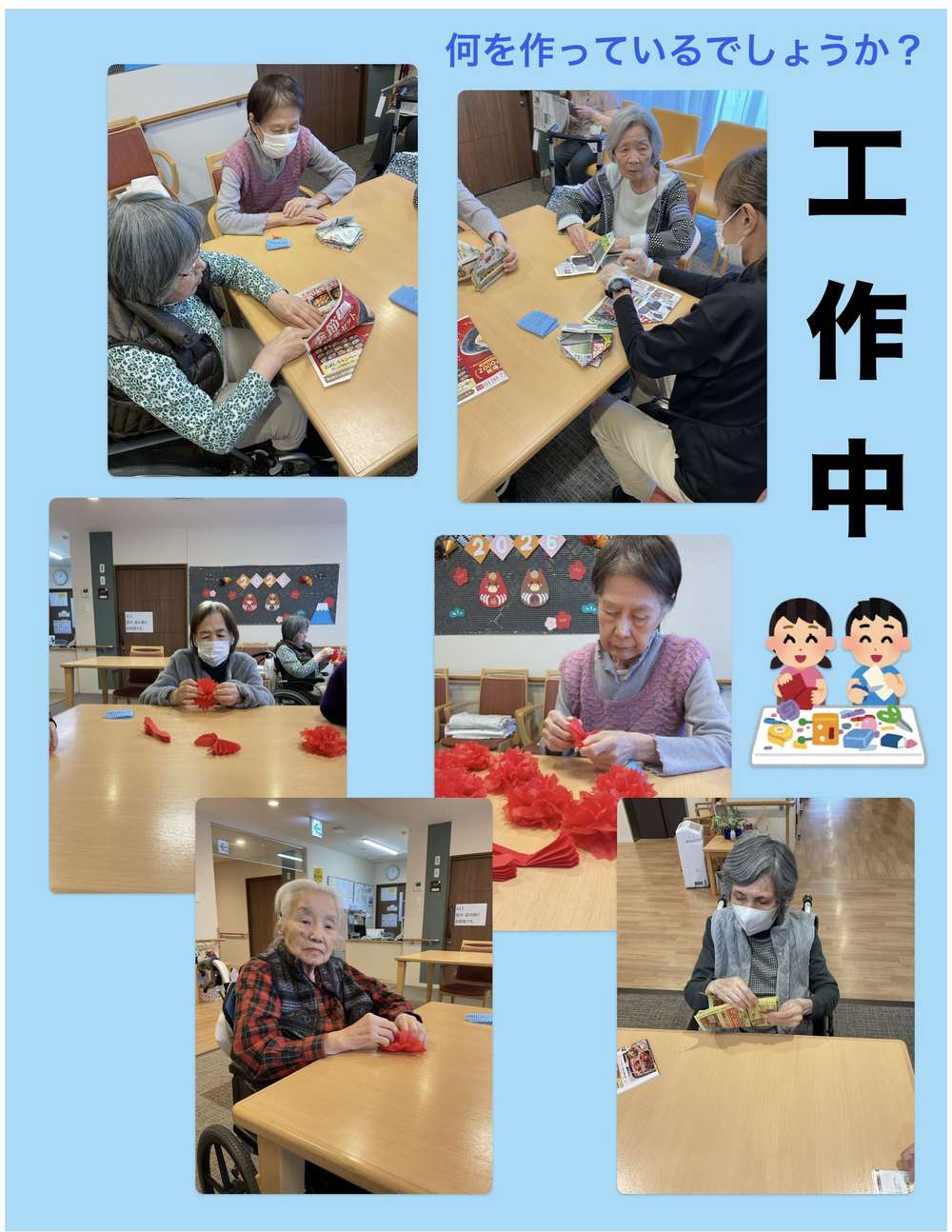 2月のレク、壁飾りに使うあるものをお客様と一緒につくりました。