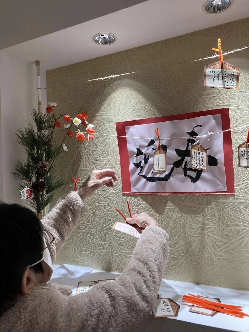 澄み渡る空と諏訪湖の景色、穏やかで美しいお正月となりました。この景色を眺めていると背筋が伸びるような清々しい気持ちになります。エントランスには新春を彩る立派な花を飾っています。緑の松に鮮やかな南天、椿の花が映え、面会に来られたご家族様も「綺麗だね。お正月らしいくてとってもいいですね」と大変好評です。