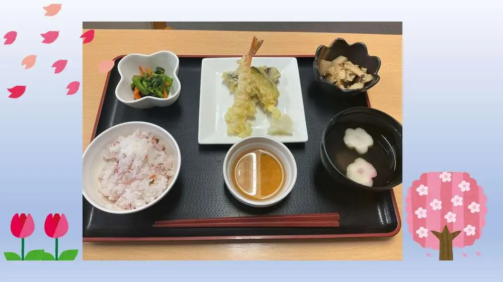 お釈迦様の誕生をお祝いするこの日に合わせ、当施設では春の息吹をたっぷり詰め込んだ、彩り豊かな行事食をご用意いたしました。