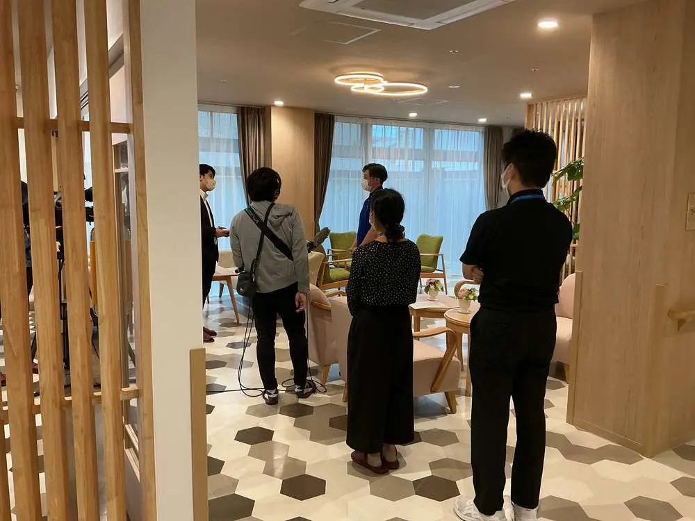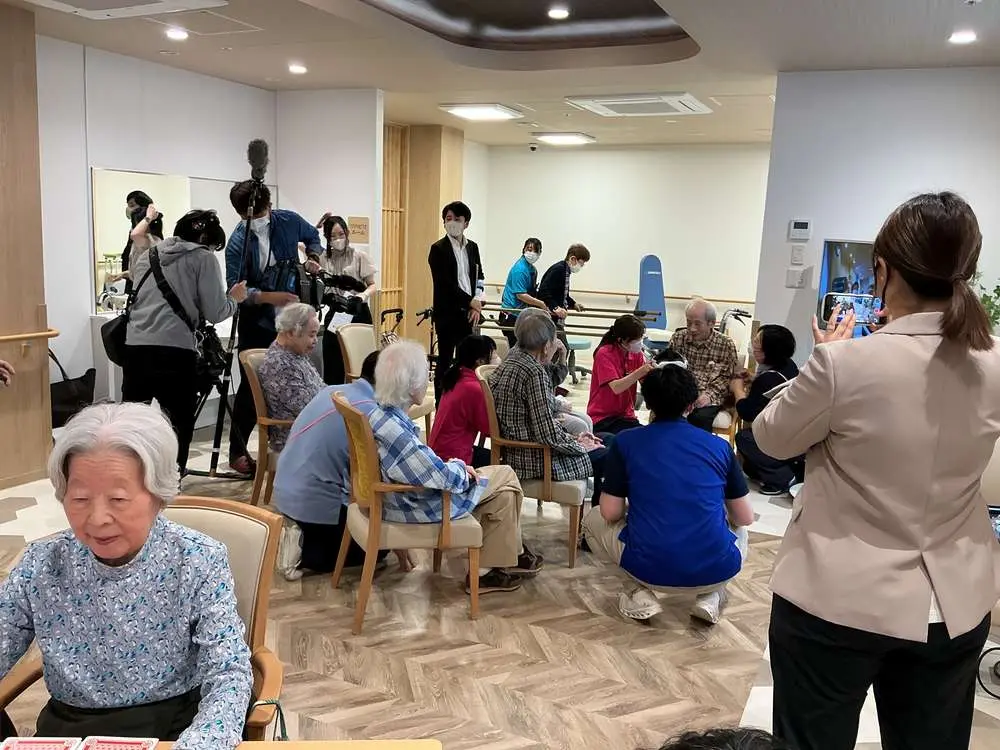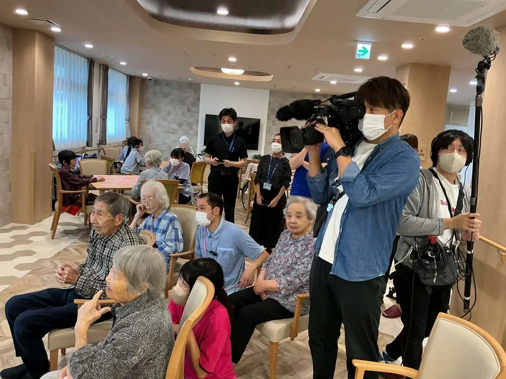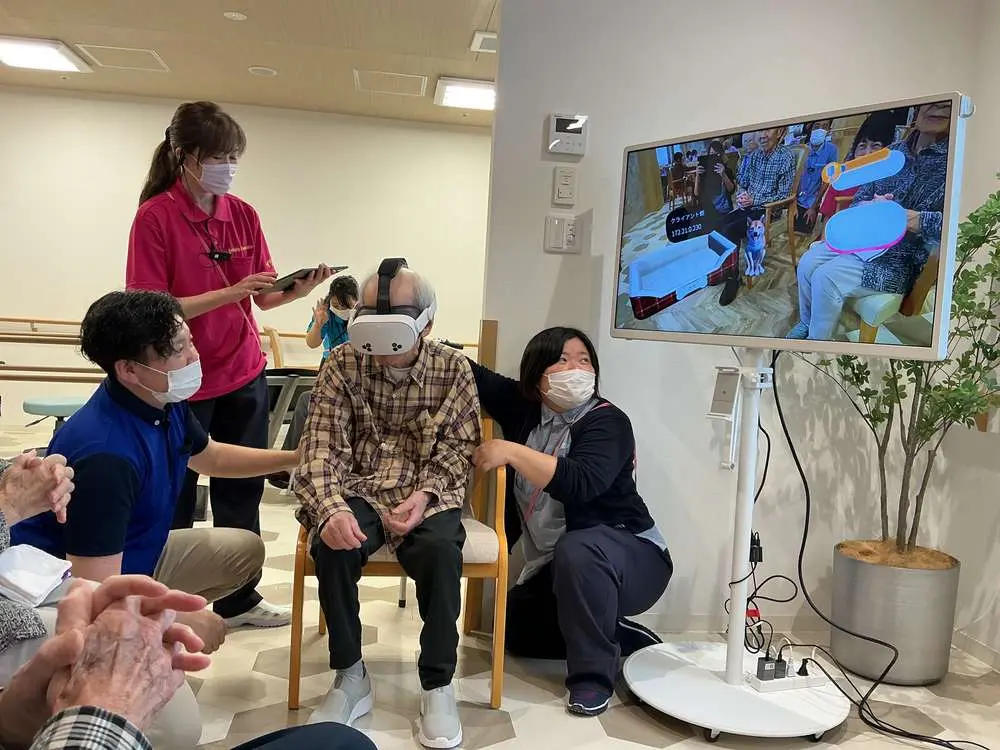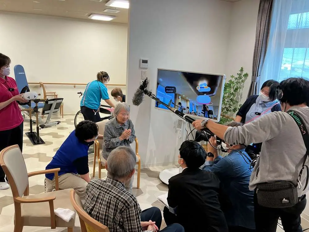 取材ということで、いつもと違った雰囲気に入居者様も職員ドキドキでしたが、入居者様にはVRワンちゃんやテーブルレクを楽しんで頂く事ができました。残念ながら時間の関係上、VRワンちゃんは数名の入居者様のみしか実施できませんでしたが、実施後のインタビューでは楽しかったとコメントしてくださっていて、