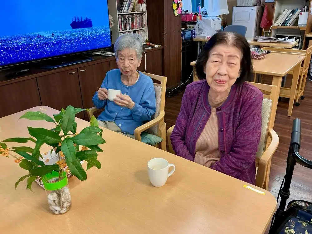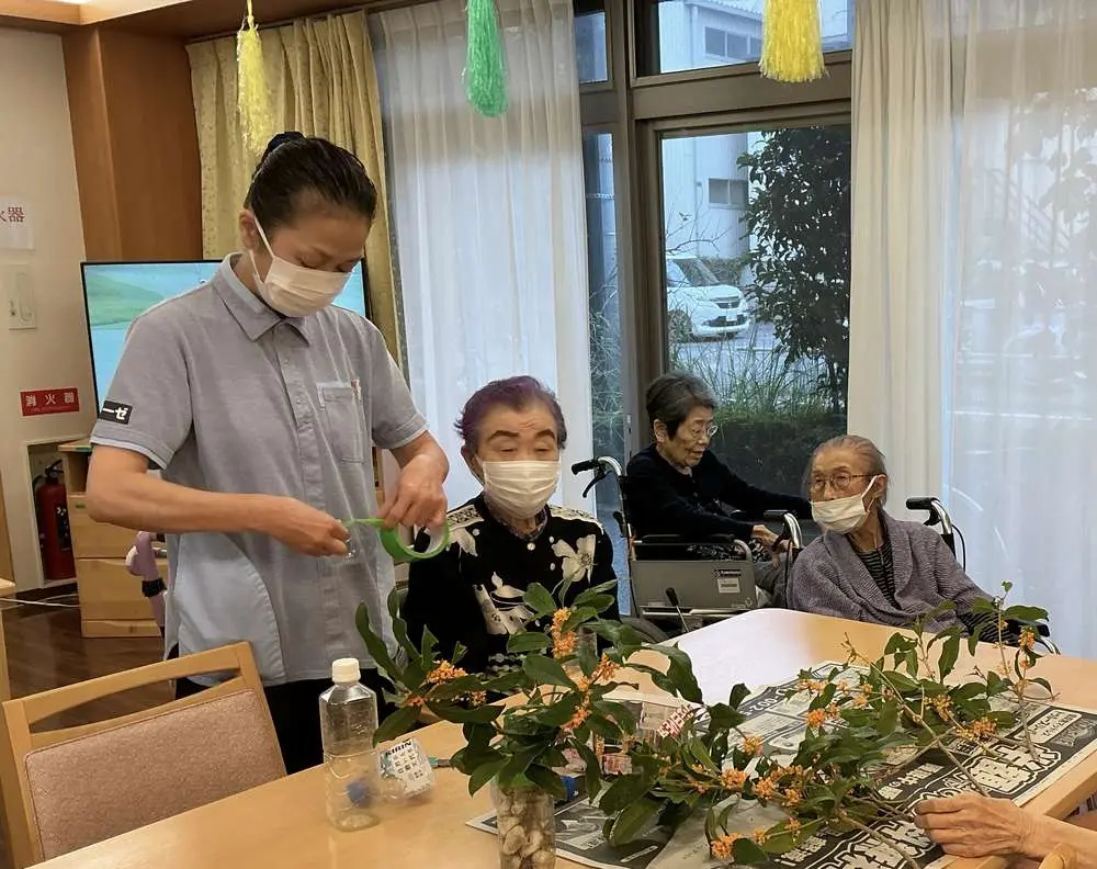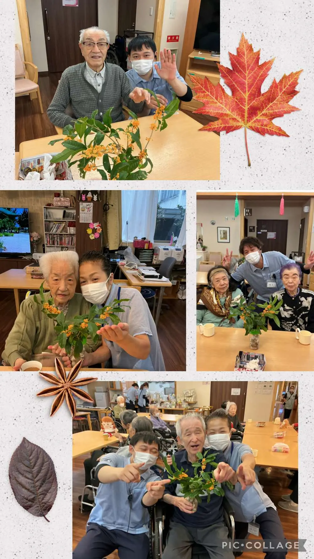 当施設の庭に金木犀が咲き始めました!本当に良い香りで、風に乗ってほのかに漂うこの時期は、秋を感じさせてくれる瞬間です。枝を何本か拝借し、入居者様と一緒にお花を生けてみました。