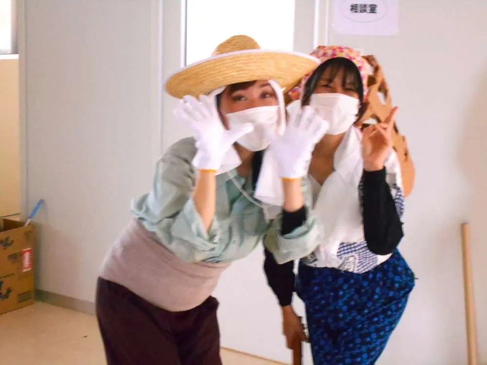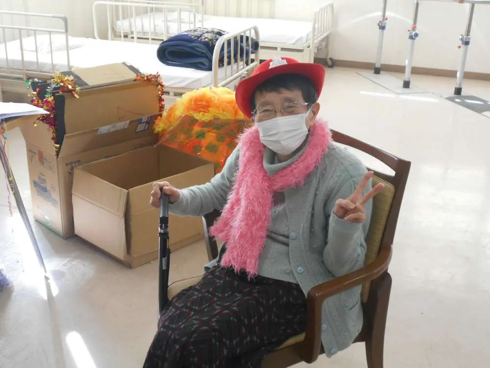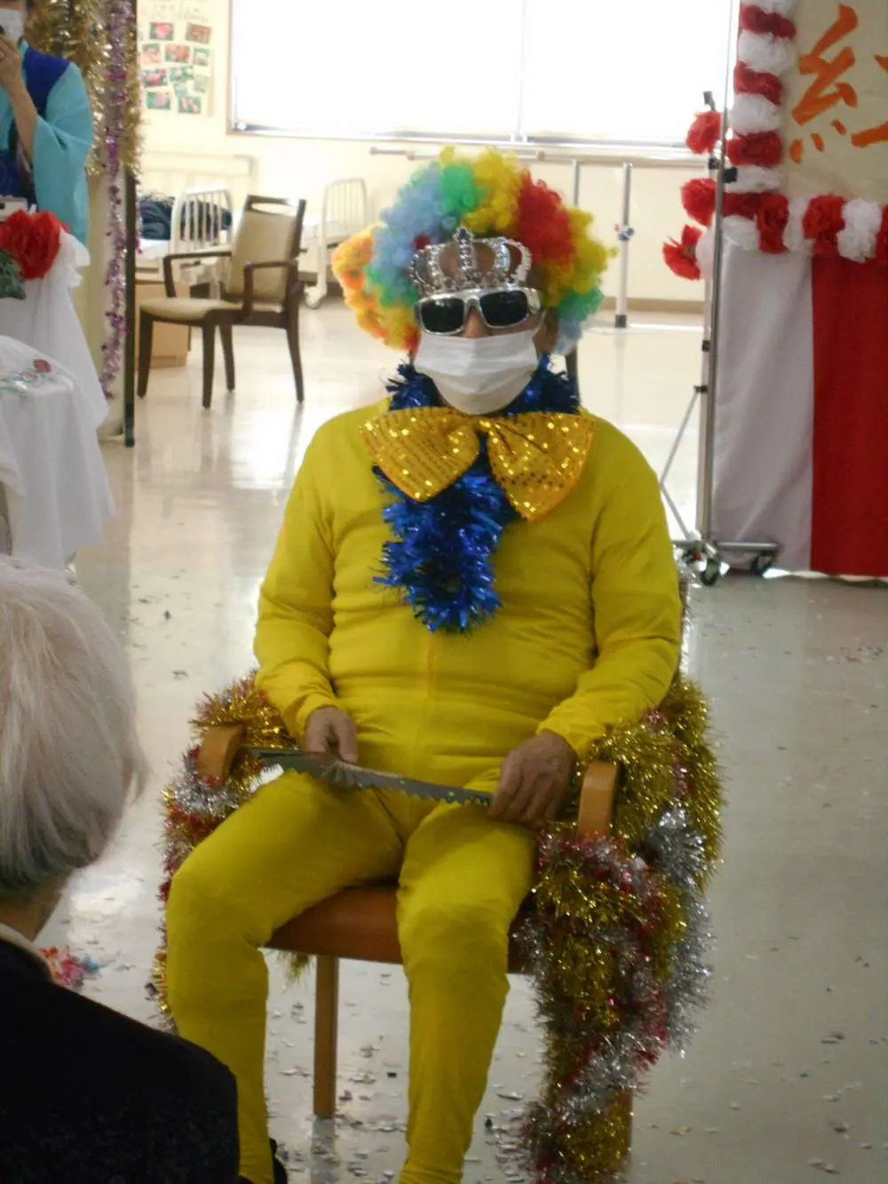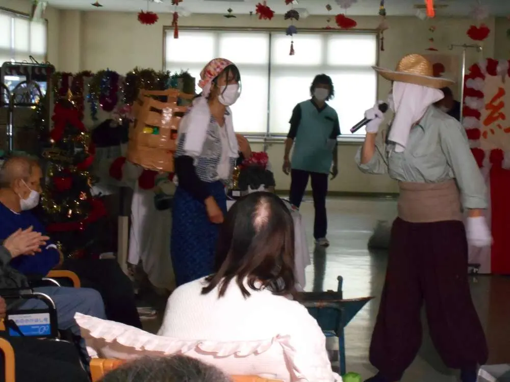 歌わない方も職員の出し物で笑っていただきました。まずは、熊退治ショートコントからの麦畑🎶オヨネがしょっているカゴはなんとご利用者様方に段ボールで編んで頂きました!麦畑からの「ダンシングヒーロー」🕺仕事終わりに毎日練習致しました。皆さん、大笑い😂その笑顔を見ると職員の疲れも吹っ飛びます😆「笑う門には福来る」😆寒い日が続いていますがお体に気をつけてお過ごし下さい✨