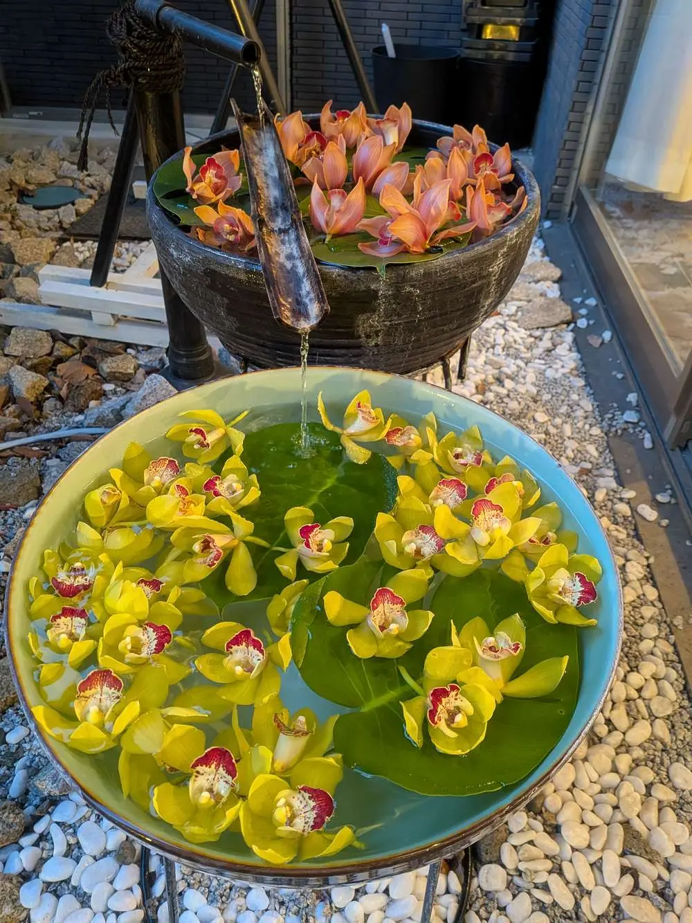 手水舎には水面に花を浮かべることで、訪れる方々に