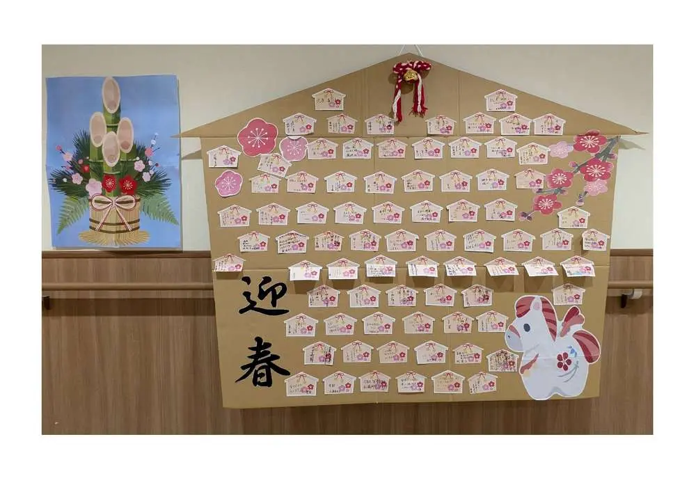 それとは別に、施設内では皆様の抱負を載せた絵馬を飾っています。実はこっそり職員の分も入っています。イリーゼ瑞穂汐路へ来られた際は、どうぞご覧下さいませ!
