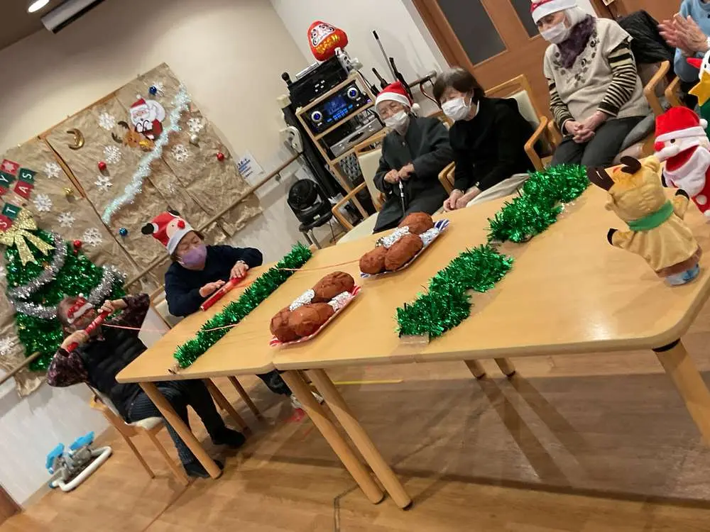 クリスマスレク・チキン運び クリスマスの御馳走と言えば【チキン】職員がレクリエーション用に本物そっくりにチキンを作ってくれました🍗 とっても美味しそうに出来たチキンを前に「焼き芋…⁈」と首をかしげるご利用者さまも… がお皿に盛りつけると【チキン】そのものに私は見えました(#^^#) お皿に盛られて【チキン】を途中の障害物・段差で落とすことなく手元までたぐり寄せ、その順位を競うゲーム 大きなクリスマスツリーに見守られながら、皆さま腕を大きく上げてお皿の向きなどバランスをとり、各チームの応援を受け、楽しまれていました🎄🎅🎄