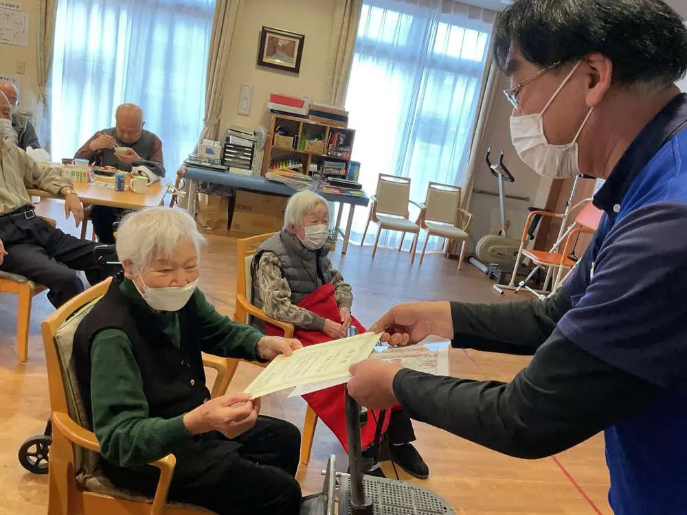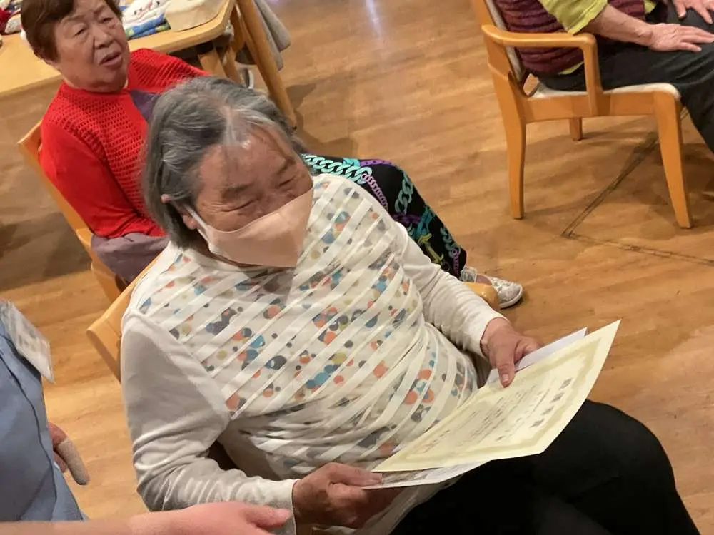 オンラインで行われた表彰式に参加され、各賞状を授与させて頂いています。全国の他施設の方々の作品もどれも素晴らしく、デイーサービスの皆さまで鑑賞しながら次回の夏の塗り絵大会への参加への意欲を高められていました