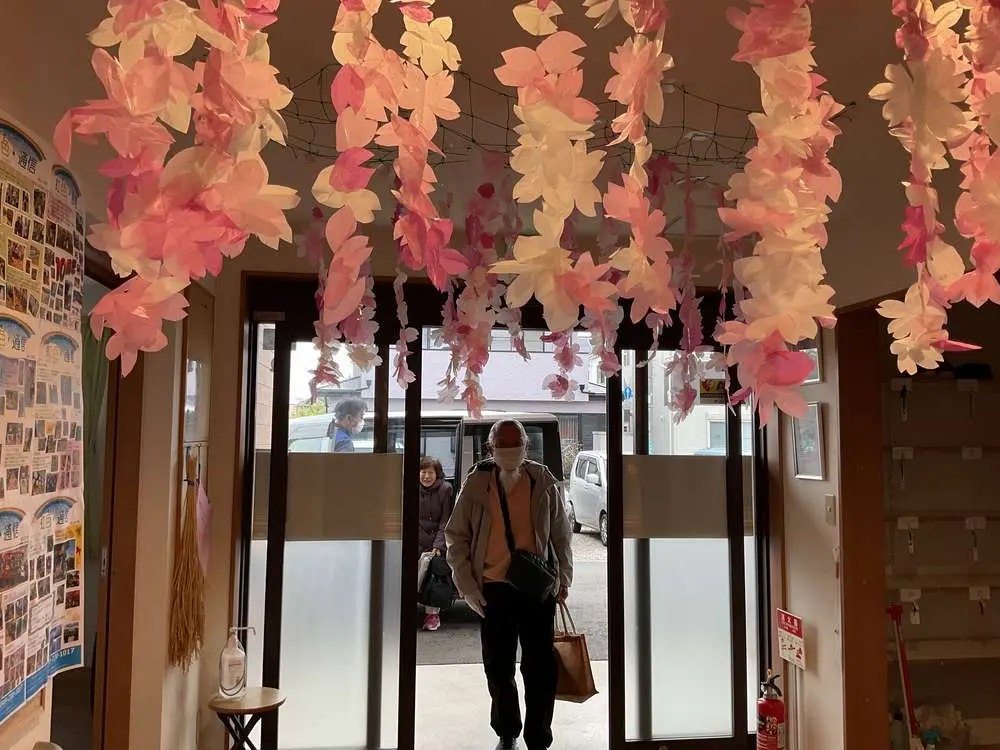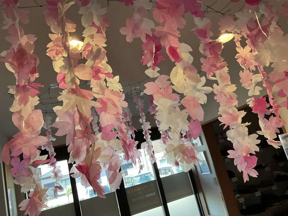 雰囲気だけでも、お花見と共に《お花見弁当》を楽しんでいただけるよう玄関ホールに桜を作成しお出迎えしています!