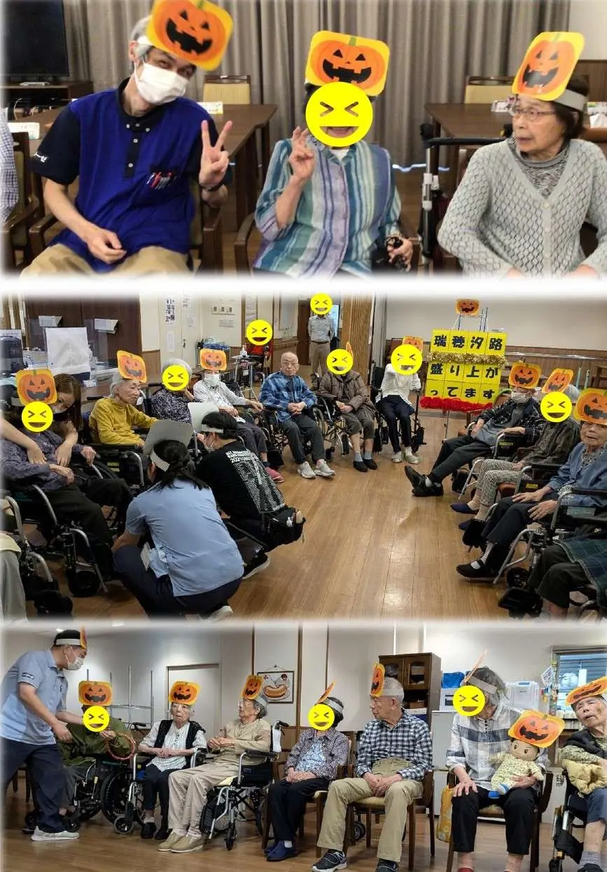 ハロウィン時期なので、スタッフも入居者様も全員でカボチャのお面を付けて参加しました。