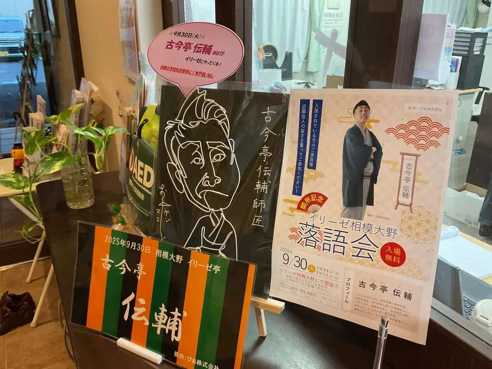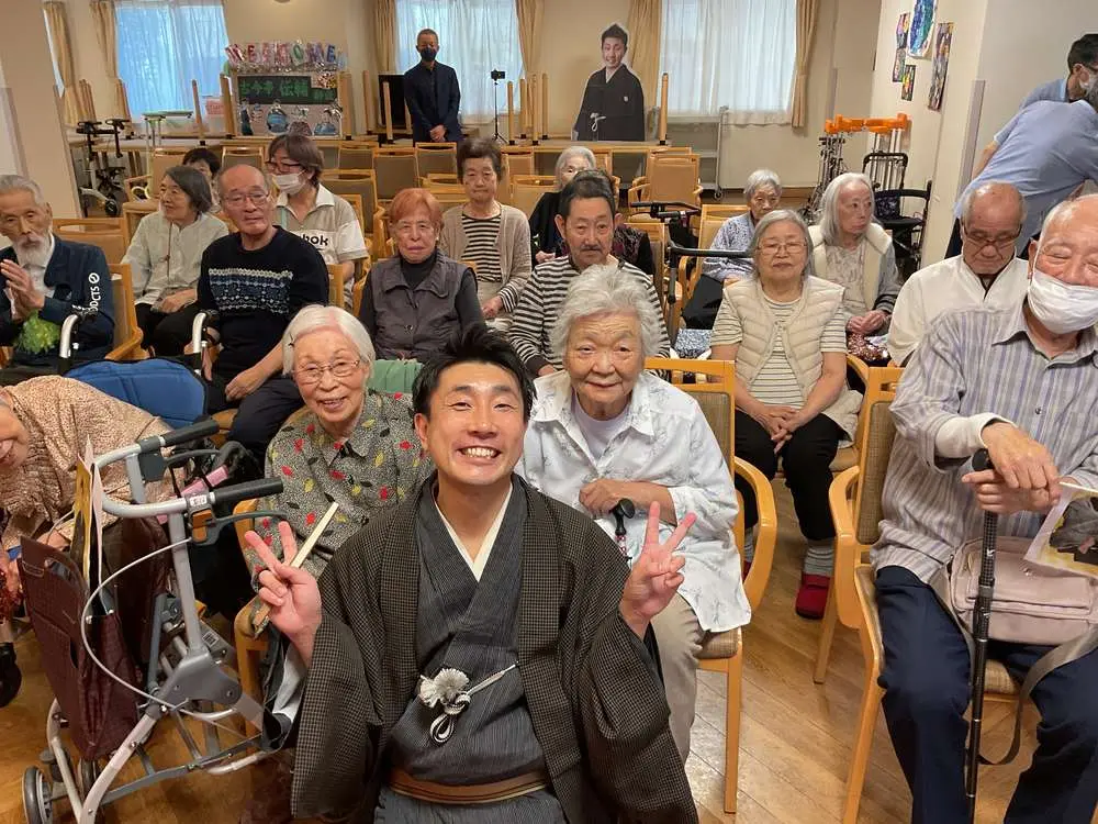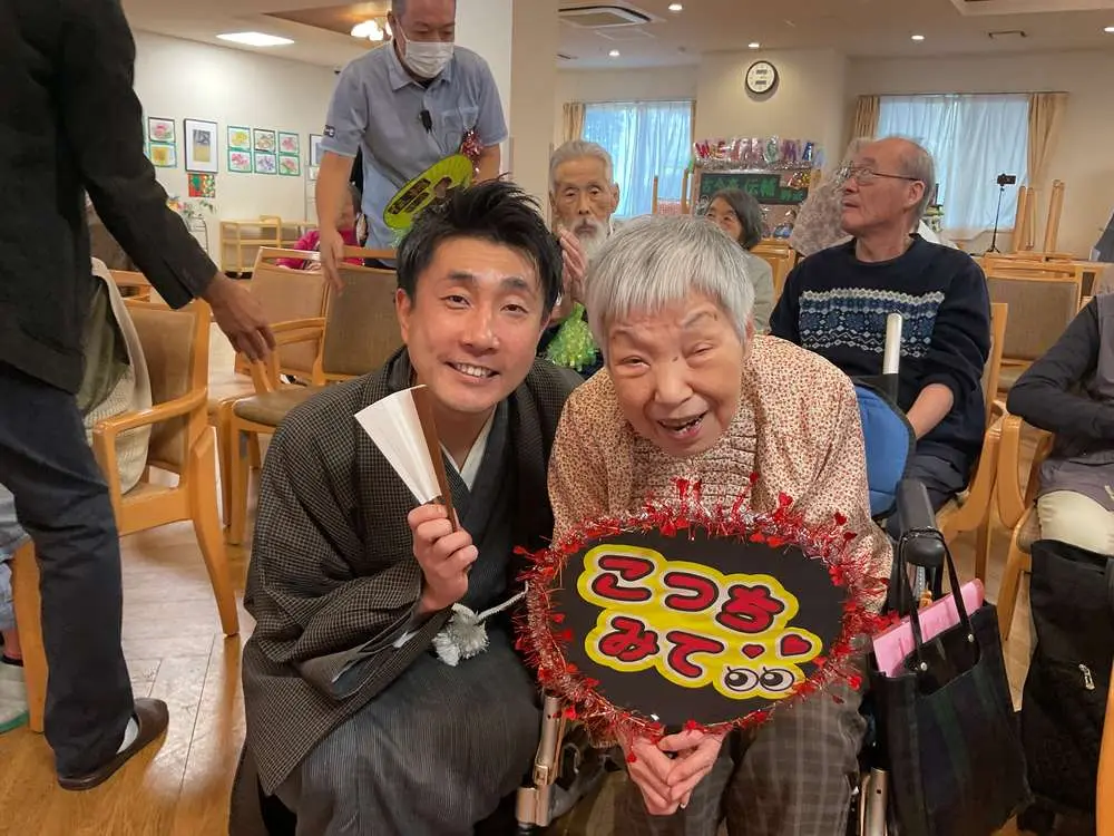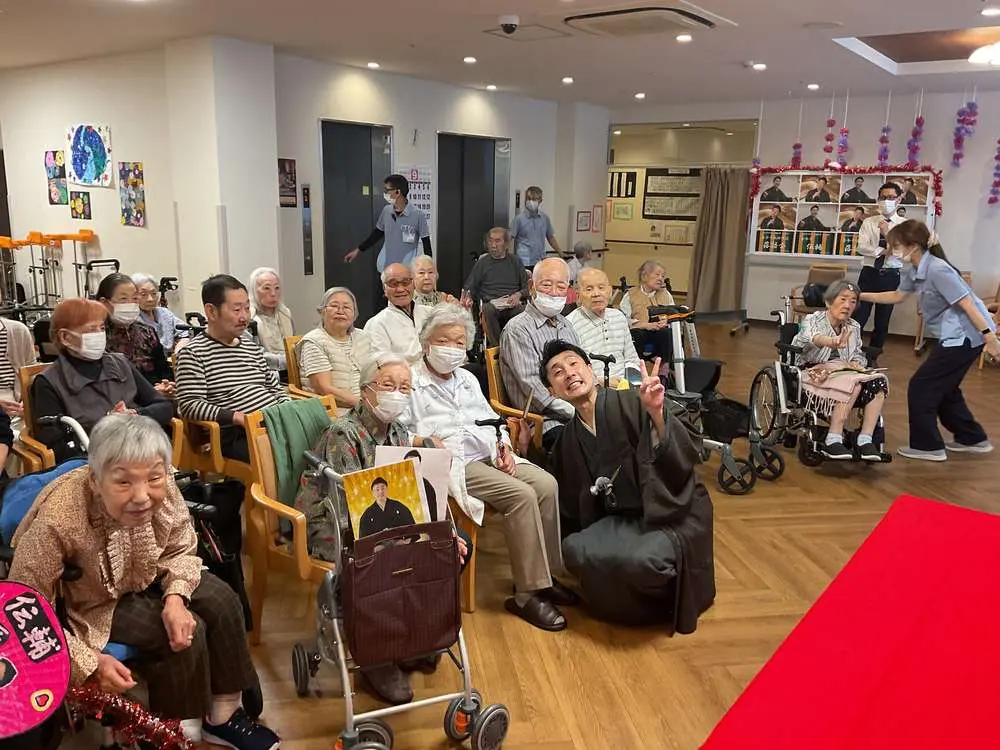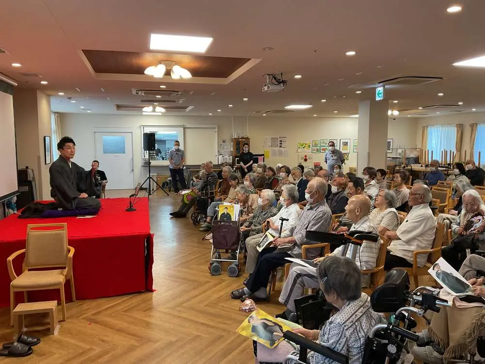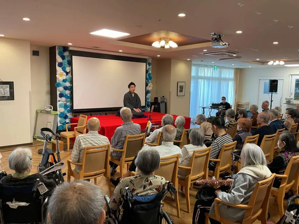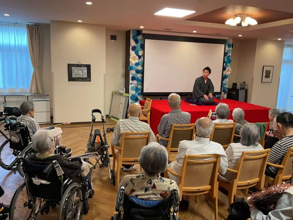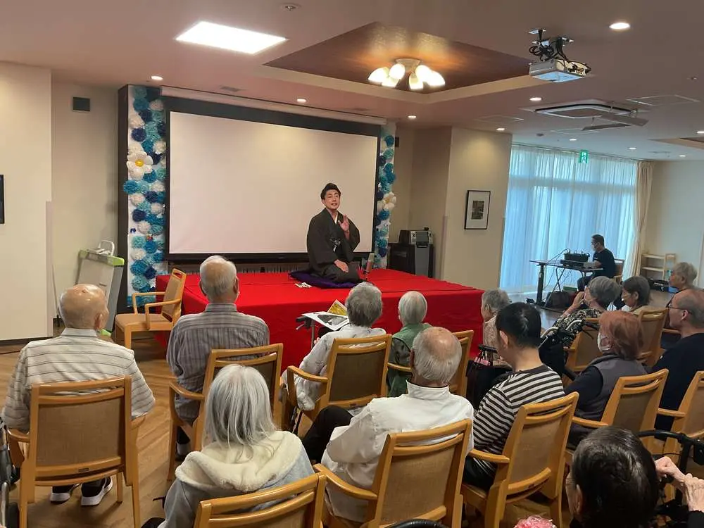 イリーゼ相模大野で、はじめて落語会を催しました! ぴあ株式会社様の提供をいただきまして、古今亭伝輔師匠に一席頂きました。 師匠は、なんと介護のお仕事をされていた経験があり、介護福祉士の資格をお持ちです。 みなさんの話のツボもすっかりおわかりで、みなさん、思わず大きな声をあげて笑っていらっしゃいました。 まくらに扇子と手拭いの使い方でひと笑い、高座があたたまったところで、噺を二席いただき、またまた大きな笑いが巻き起こりました! 笑顔いっぱいのイリーゼ相模大野らしい一日になりました。