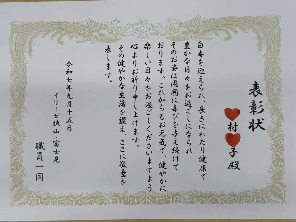 敬老の日を迎え、白寿・卒寿・米寿の方に表彰状をお渡ししました。