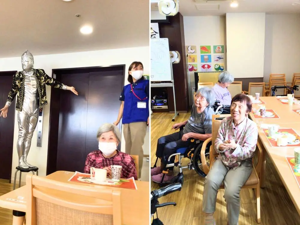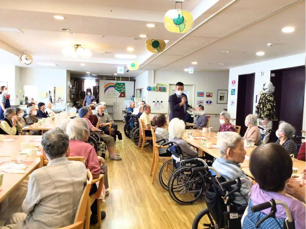 食堂に集まり、食事や職員による出し物などを通し、笑顔あふれるひとときを過ごしました。