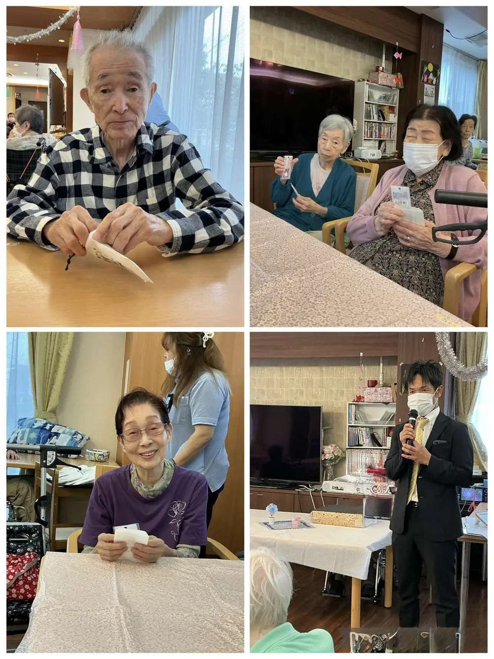 旧ホーム長から始まったホーム長レクを、現ホーム長が引き継ぎ毎月開催しているこのレク。今回、さだまさしばりの歌声でレクを行っていたところに、旧ホーム長も特別参加!