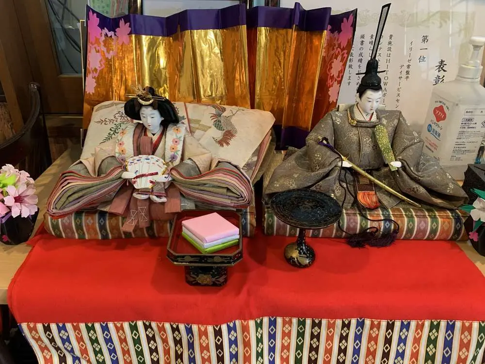 玄関に飾ったひな人形の前で記念撮影!!